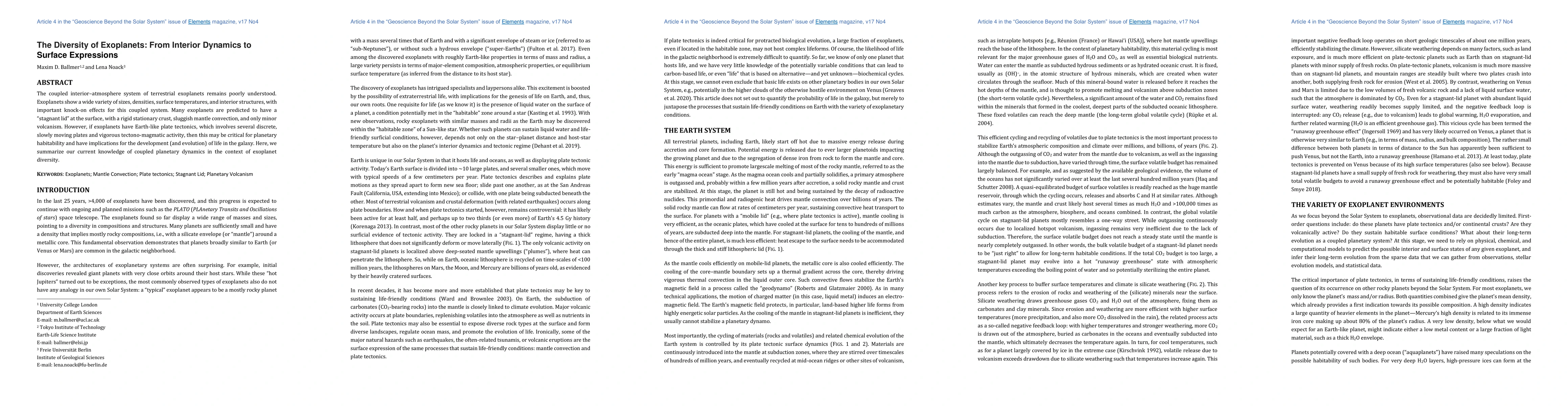 The coupled interior-atmosphere system of terrestrial exoplanets remains poorly understood. Exoplanets show a wide variety of sizes, densities, surface temperatures, and interior structures, with important knock-on effects for this coupled system. Many exoplanets are predicted to have a "stagnant lid" at the surface, with a rigid stationary crust, sluggish mantle convection, and only minor volcanism. However, if exoplanets have Earth-like plate tectonics, which involves several discrete, slowly moving plates and vigorous tectono-magmatic activity, then this may be critical for planetary habitability and have implications for the development (and evolution) of life in the galaxy. Here, we summarize our current knowledge of coupled planetary dynamics in the context of exoplanet diversity.