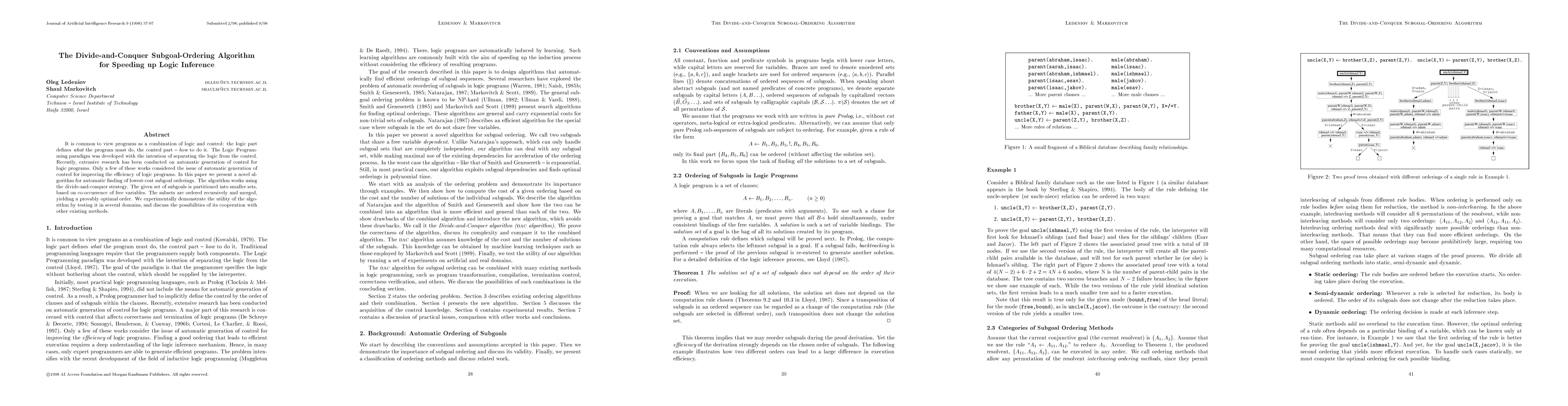 The paper introduces a divide-and-conquer algorithm to find optimal subgoal orderings for enhancing logic inference efficiency, partitioning subgoals based on variable co-occurrence and recursively merging ordered subsets for optimal performance. The algorithm's effectiveness is demonstrated through experimental testing across various domains.