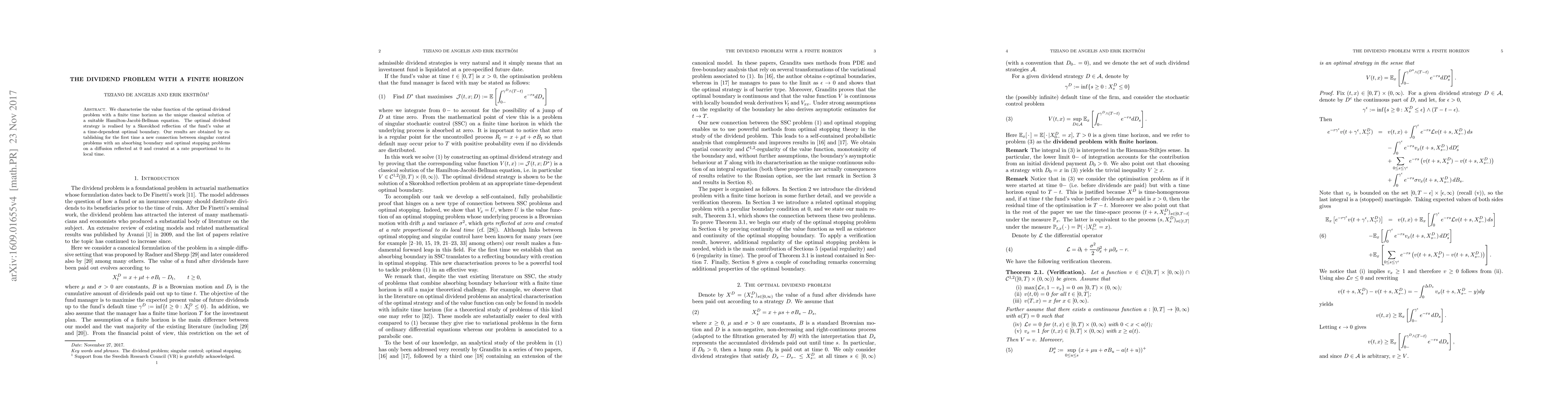 This paper characterizes the optimal dividend strategy in a finite horizon setting, showing it corresponds to a Skorokhod reflection of the fund's value at an optimal boundary. The solution is derived by establishing a novel link between singular control problems and optimal stopping in reflected diffusion processes.