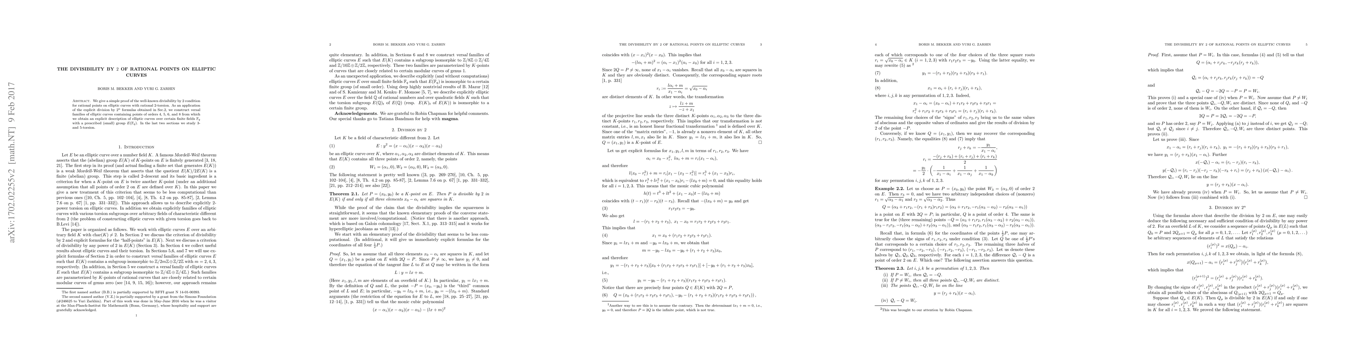 We give a simple proof of the well-known divisibility by 2 condition for rational points on elliptic curves with rational 2-torsion. As an application of the explicit division by $2^n$ formulas obtained in Sec.2, we construct versal families of elliptic curves containing points of orders 4, 5, 6, and 8 from which we obtain an explicit description of elliptic curves over certain finite fields $\mathbb{F}_q$ with a prescribed (small) group $E(\mathbb{F}_q)$. In the last two sections we study 3- and 5-torsion. This paper supercedes arXiv:1605.09279 [math.NT] .