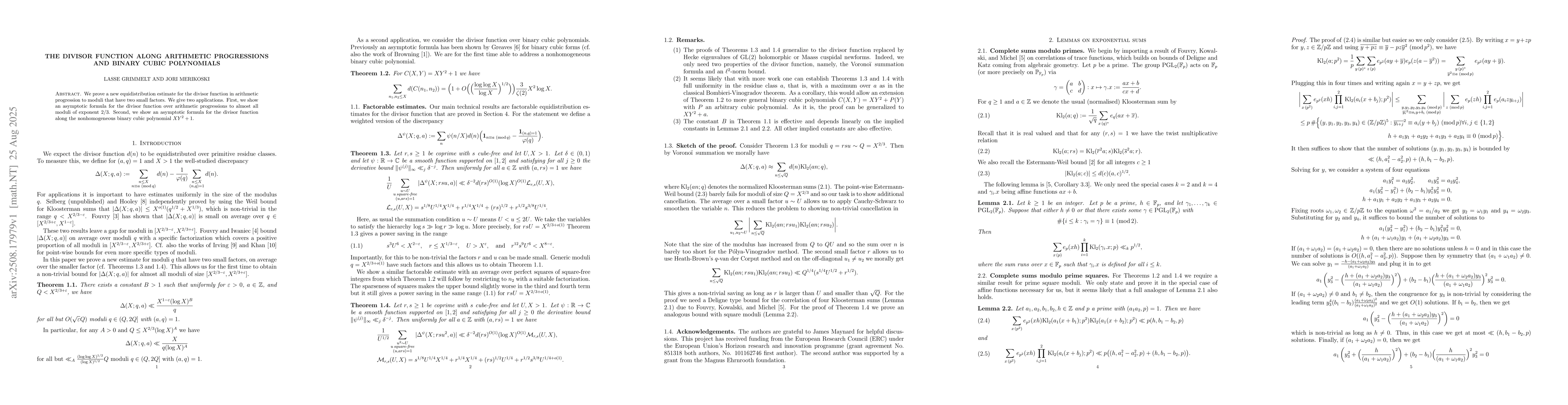 We prove a new equidistribution estimate for the divisor function in arithmetic progression to moduli that have two small factors. We give two applications. First, we show an asymptotic formula for the divisor function over arithmetic progressions to almost all moduli of exponent $2/3$. Second, we show an asymptotic formula for the divisor function along the nonhomogeneous binary cubic polynomial $X Y^2+1$.