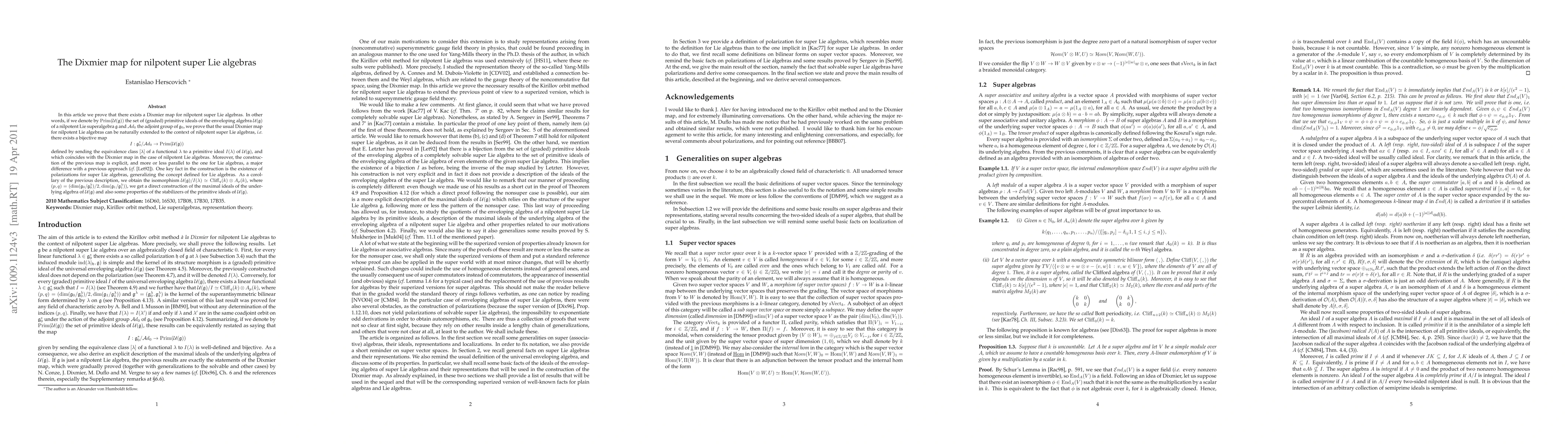 In this article we prove that there exists a Dixmier map for nilpotent super Lie algebras. In other words, if we denote by Prim(U(g)) the set of (graded) primitive ideals of the enveloping algebra U(g) of g and Ad_0 the adjoint group of g_0, we prove that the usual Dixmier map for nilpotent Lie algebras can be naturally extended to the context of nilpotent super Lie algebras, i.e. there exists a bijective map \[ I : g_0^*/Ad_0 \rightarrow Prim(U(g)), \] defined by sending the equivalence class [lambda] of a functional lambda to a primitive ideal I(lambda) of U(g), and which coincides with the Dixmier map in the case of nilpotent Lie algebras. Moreover, the construction of the previous map is explicit, and more or less parallel to the one for Lie algebras, a major difference with a previous approach. One key fact in the construction is the existence of polarizations for super Lie algebras, generalizing the concept defined for Lie algebras. As a corollary of the previous description, we obtain that the quotient of the enveloping algebra by the ideal I(lambda) is isomorphic to the tensor product Cliff_q(k) \otimes A_p(k) of a Clifford algebra and a Weyl algebra, where (p,q) = (dim(g_0/g_0^{lambda})/2,dim(g_1/g_1^{lambda})), we get a direct construction of the maximal ideals of the underlying algebra of U(g) and also some properties of the stabilizers of the primitive ideals of U(g).