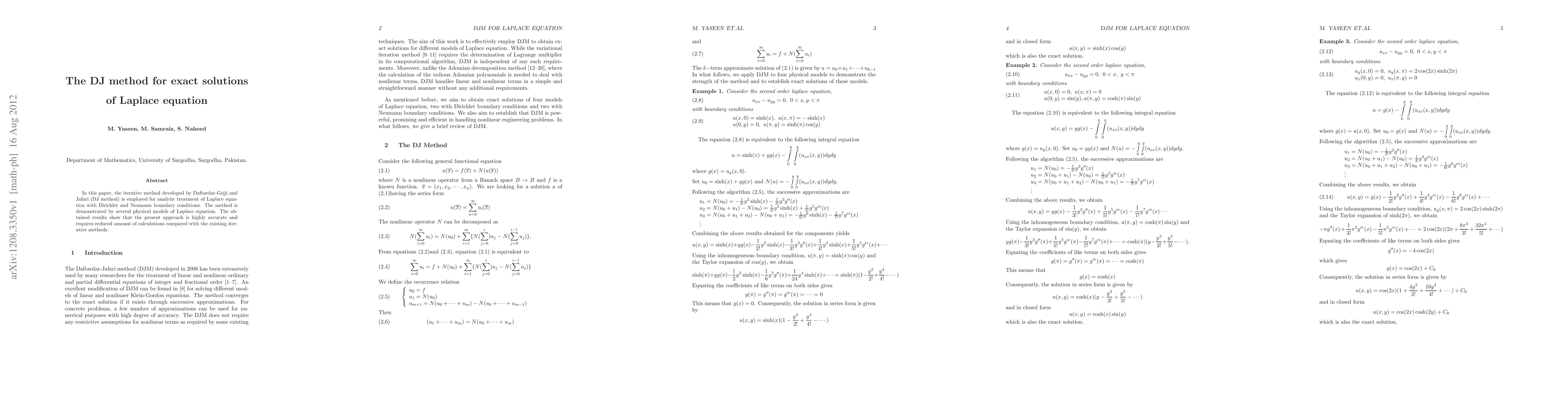 In this paper, the iterative method developed by Daftardar-Gejji and Jafari (DJ method) is employed for analytic treatment of Laplace equation with Dirichlet and Neumann boundary conditions. The method is demonstrated by several physical models of Laplace equation. The obtained results show that the present approach is highly accurate and requires reduced amount of calculations compared with the existing iterative methods.