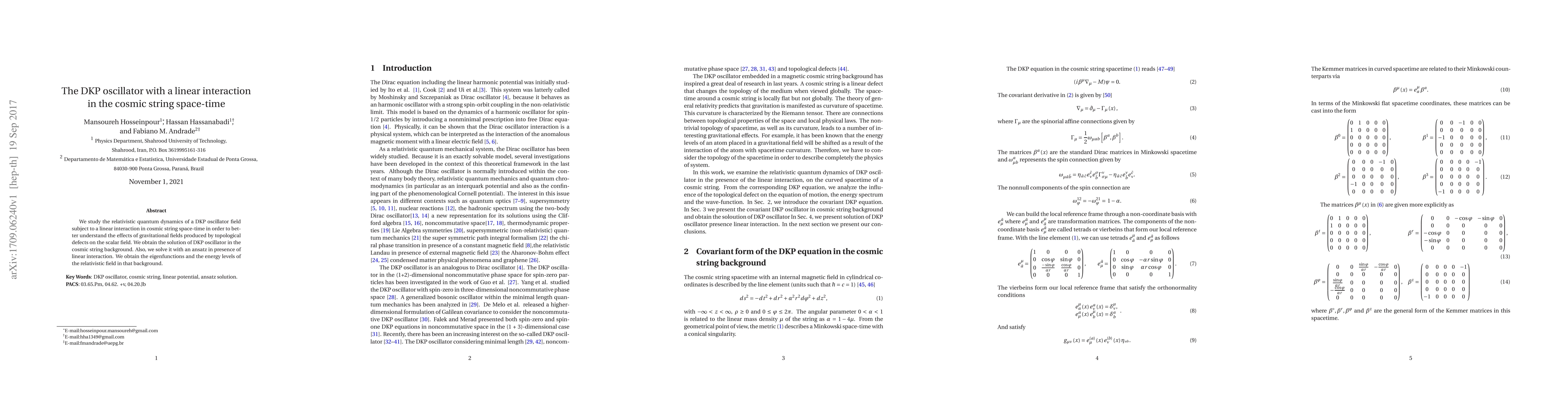 This research investigates the relativistic quantum dynamics of a DKP oscillator in cosmic string space-time, obtaining solutions for the oscillator under linear interaction, and determining its eigenfunctions and energy levels in this gravitational field context.