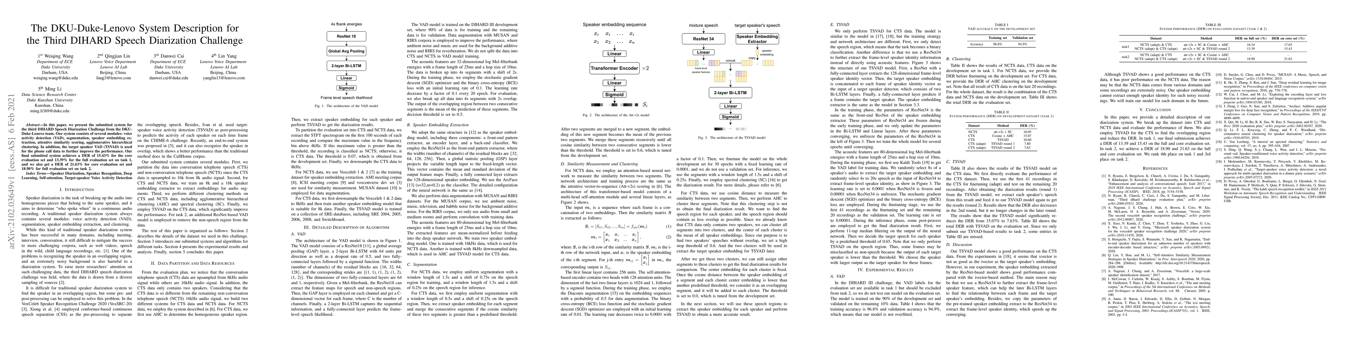 The DKU-Duke-Lenovo team's system for the third DIHARD Speech Diarization Challenge includes modules for voice activity detection, segmentation, speaker embedding extraction, and clustering, achieving DERs of 15.43% and 13.39% for tasks 1, and 21.63% and 18.90% for tasks 2.