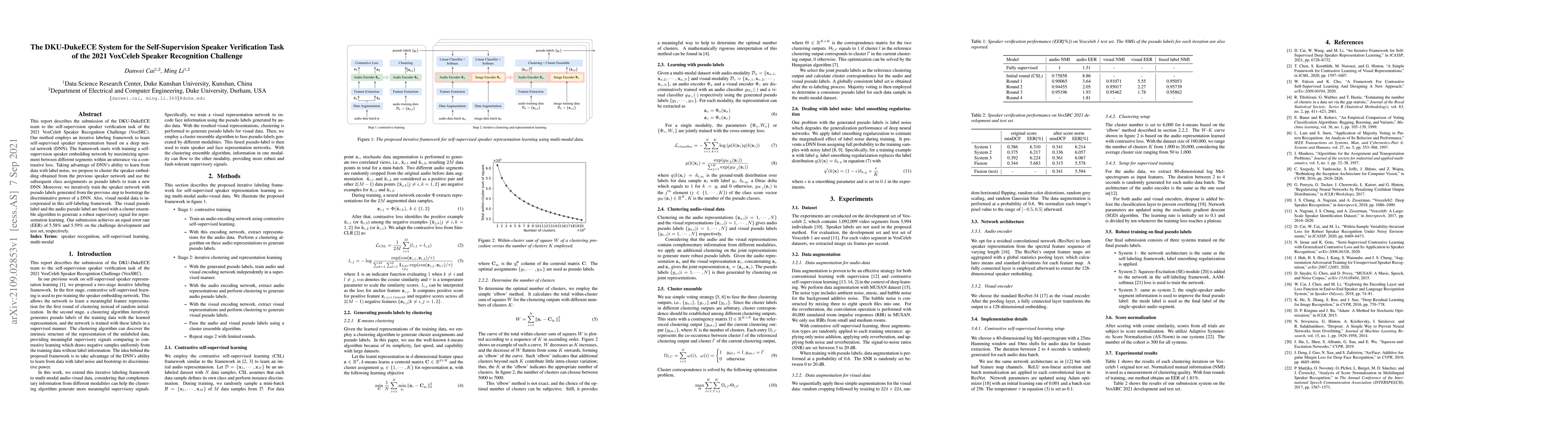 This report describes the submission of the DKU-DukeECE team to the self-supervision speaker verification task of the 2021 VoxCeleb Speaker Recognition Challenge (VoxSRC). Our method employs an iterative labeling framework to learn self-supervised speaker representation based on a deep neural network (DNN). The framework starts with training a self-supervision speaker embedding network by maximizing agreement between different segments within an utterance via a contrastive loss. Taking advantage of DNN's ability to learn from data with label noise, we propose to cluster the speaker embedding obtained from the previous speaker network and use the subsequent class assignments as pseudo labels to train a new DNN. Moreover, we iteratively train the speaker network with pseudo labels generated from the previous step to bootstrap the discriminative power of a DNN. Also, visual modal data is incorporated in this self-labeling framework. The visual pseudo label and the audio pseudo label are fused with a cluster ensemble algorithm to generate a robust supervisory signal for representation learning. Our submission achieves an equal error rate (EER) of 5.58% and 5.59% on the challenge development and test set, respectively.