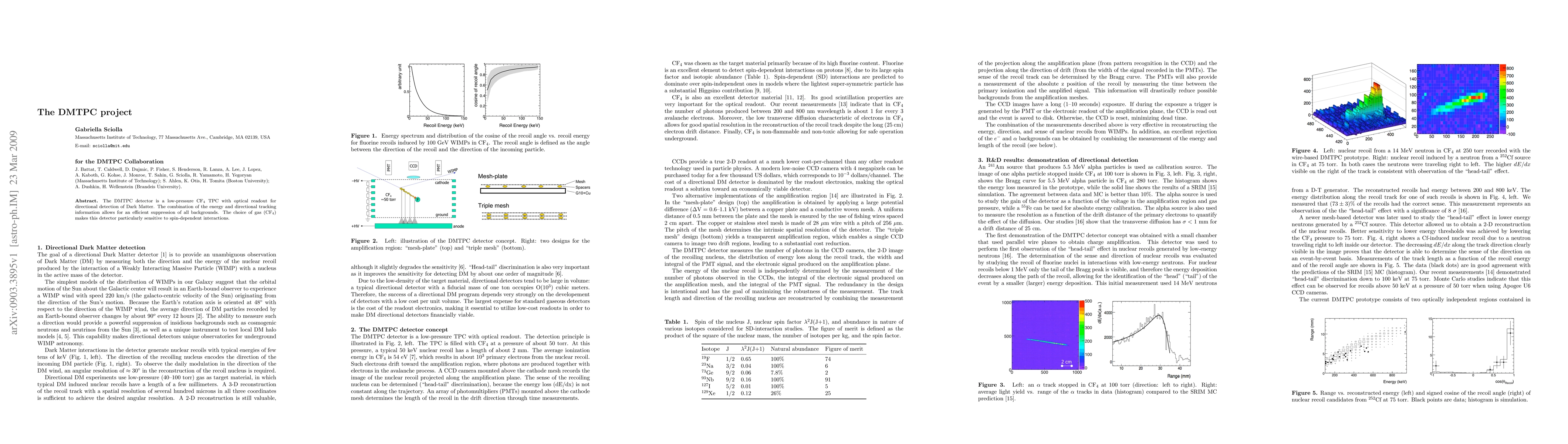 The DMTPC detector is a low-pressure CF4 TPC with optical readout for directional detection of Dark Matter. The combination of the energy and directional tracking information allows for an efficient suppression of all backgrounds. The choice of gas (CF4) makes this detector particularly sensitive to spin-dependent interactions.
