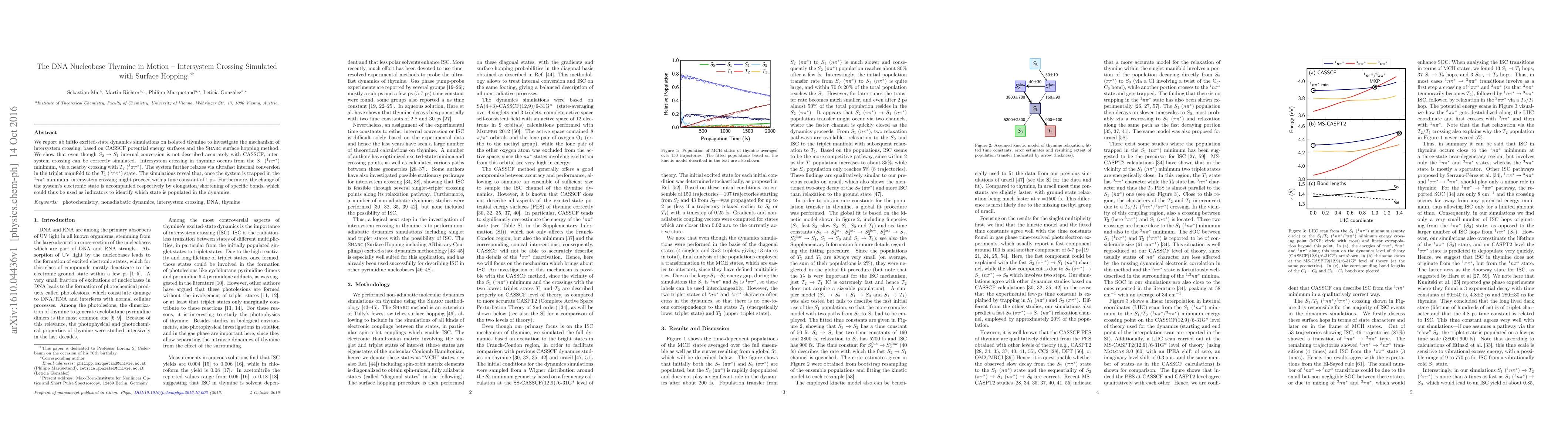 This study uses ab initio simulations to explore the intersystem crossing mechanism in thymine, revealing that it occurs via a crossing from the $S_1$ state to the $T_2$ state, followed by ultrafast relaxation to the $T_1$ state, with a time constant of 1 ps. Specific bond elongations and shortenings accompany the electronic state changes, providing indicators of state populations.