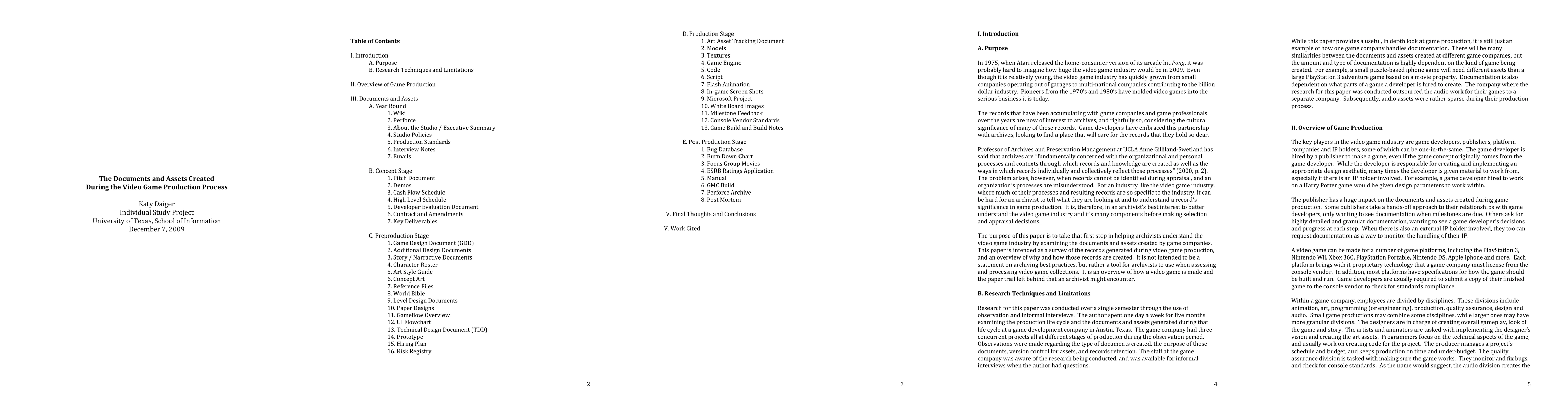 The purpose of this paper is to take that first step in helping archivists understand the video game industry by examining the documents and assets created by game companies. This paper is intended as a survey of the records generated during video game production, and an overview of why and how those records are created. It is not intended to be a statement on archiving best practices, but rather a tool for archivists to use when assessing and processing video game collections. It is an overview of how a video game is made and the paper trail left behind that an archivist might encounter.