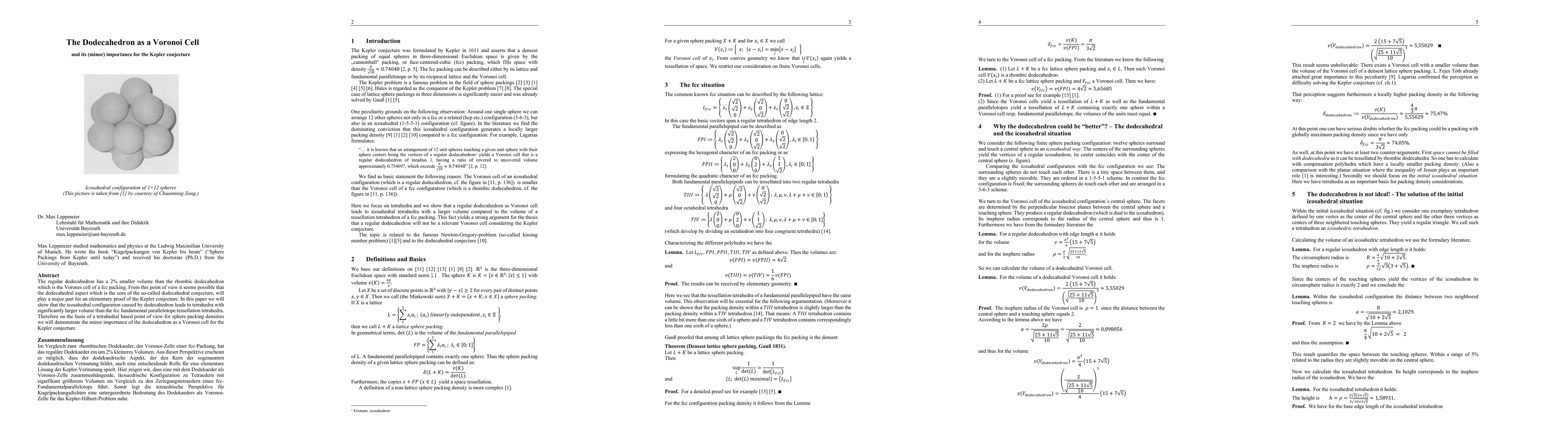 This paper investigates the volume difference between the regular dodecahedron and the rhombic dodecahedron, which is the Voronoi cell of an fcc packing, concluding that the dodecahedron plays a minor role in supporting the Kepler conjecture due to larger tetrahedral volumes formed by icosahedral configurations.