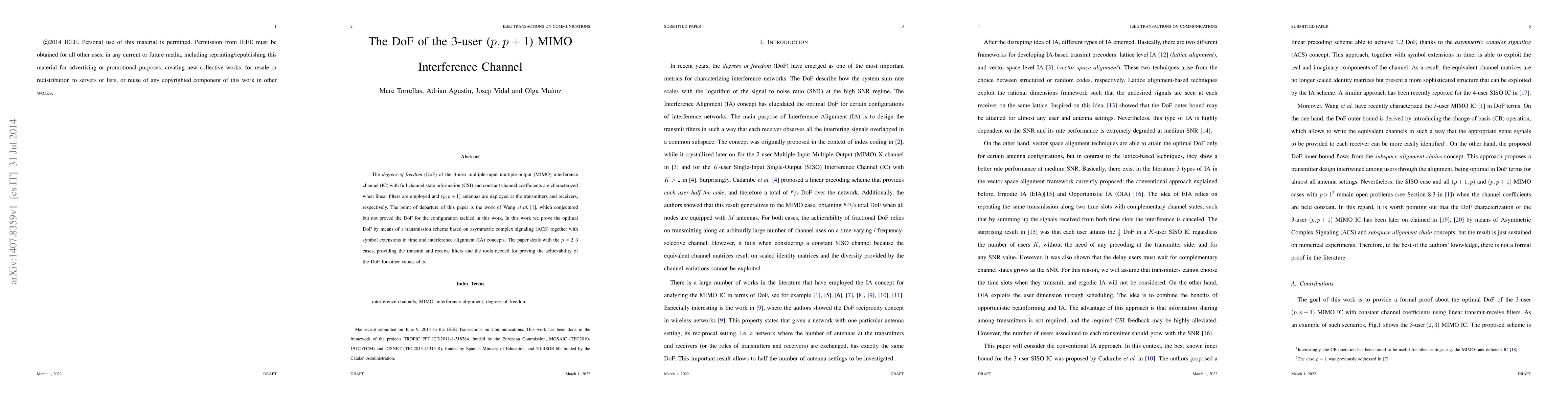 The \emph{degrees of freedom} (DoF) of the 3-user multiple-input multiple-output (MIMO) interference channel (IC) with full channel state information (CSI) and constant channel coefficients are characterized when linear filters are employed and $(p,p+1)$ antennas are deployed at the transmitters and receivers, respectively. The point of departure of this paper is the work of Wang et al, which conjectured but not proved the DoF for the configuration tackled in this work. In this work we prove the optimal DoF by means of a transmission scheme based on asymmetric complex signaling (ACS) together with symbol extensions in time and interference alignment (IA) concepts. The paper deals with the $p=2,3$ cases, providing the transmit and receive filters and the tools needed for proving the achievability of the DoF for other values of $p$.