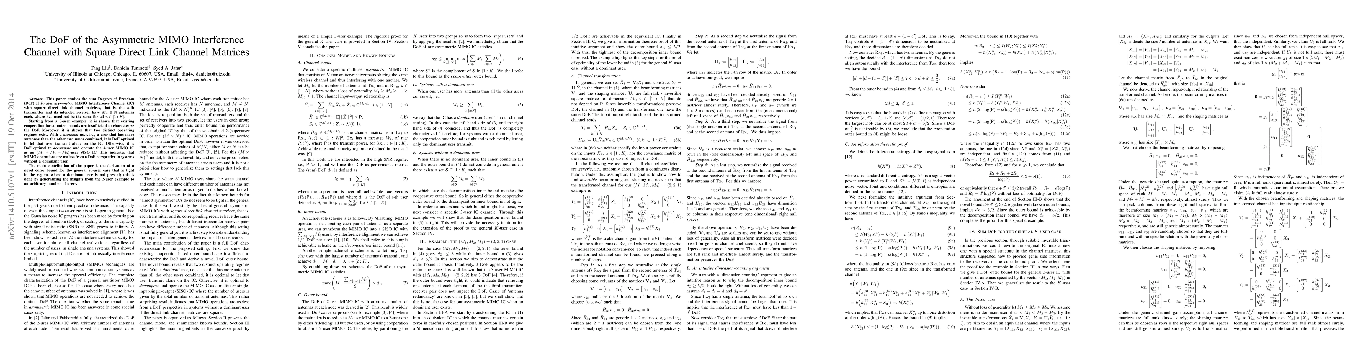 This paper studies the sum Degrees of Freedom (DoF) of $K$-user {\em asymmetric} MIMO Interference Channel (IC) with square direct link channel matrices, that is, the $u$-th transmitter and its intended receiver have $M_u\in\mathbb{N}$ antennas each, where $M_u$ need not be the same for all $u\in[1:K]$. Starting from a $3$-user example, it is shown that existing cooperation-based outer bounds are insufficient to characterize the DoF. Moreover, it is shown that two distinct operating regimes exist. With a {\it dominant} user, i.e., a user that has more antennas than the other two users combined, %(say $M_1\geq M_2+M_3$), it is DoF optimal to let that user transmit alone on the IC. Otherwise, it is DoF optimal to {\em decompose} and operate the 3-user MIMO IC as an $(M_1+ M_2+M_3)$-user SISO IC. This indicates that MIMO operations are useless from a DoF perspective in systems without a dominant user. The main contribution of the paper is the derivation of a novel outer bound for the general $K$-user case that is tight in the regime where a dominant user is not present; this is done by generalizing the insights from the 3-user example to an arbitrary number of users.