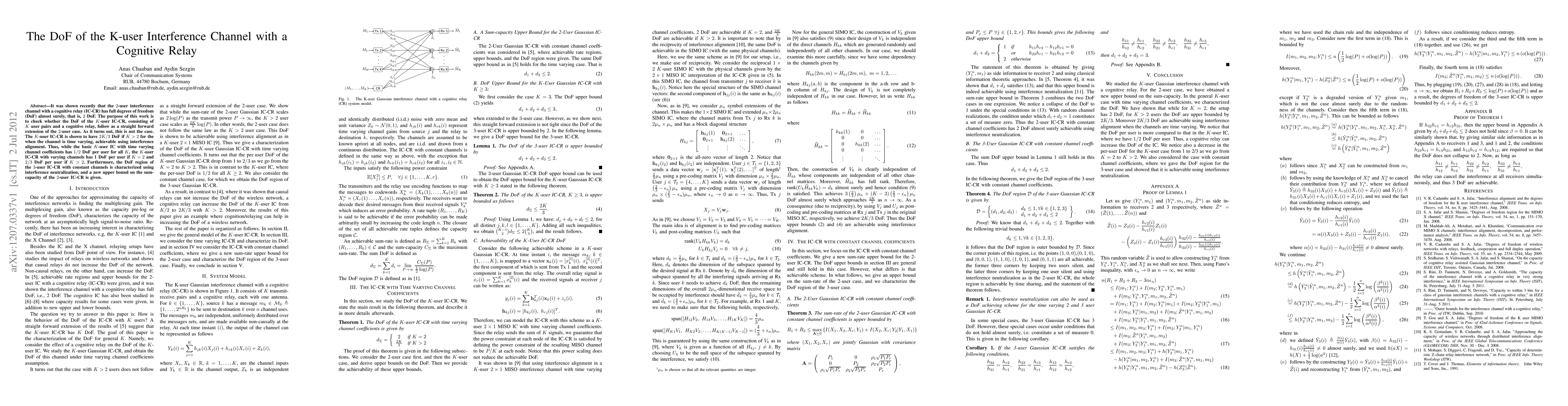 It was shown recently that the 2-user interference channel with a cognitive relay (IC-CR) has full degrees of freedom (DoF) almost surely, that is, 2 DoF. The purpose of this work is to check whether the DoF of the $K$-user IC-CR, consisting of $K$ user pairs and a cognitive relay, follow as a straight forward extension of the 2-user case. As it turns out, this is not the case. The $K$-user IC-CR is shown to have $2K/3$ DoF if $K>2$ for the when the channel is time varying, achievable using interference alignment. Thus, while the basic $K$-user IC with time varying channel coefficients has 1/2 DoF per user for all $K$, the $K$-user IC-CR with varying channels has 1 DoF per user if K=2 and 2/3 DoF per user if $K>2$. Furthermore, the DoF region of the 3-user IC-CR with constant channels is characterized using interference neutralization, and a new upper bound on the sum-capacity of the 2-user IC-CR is given.