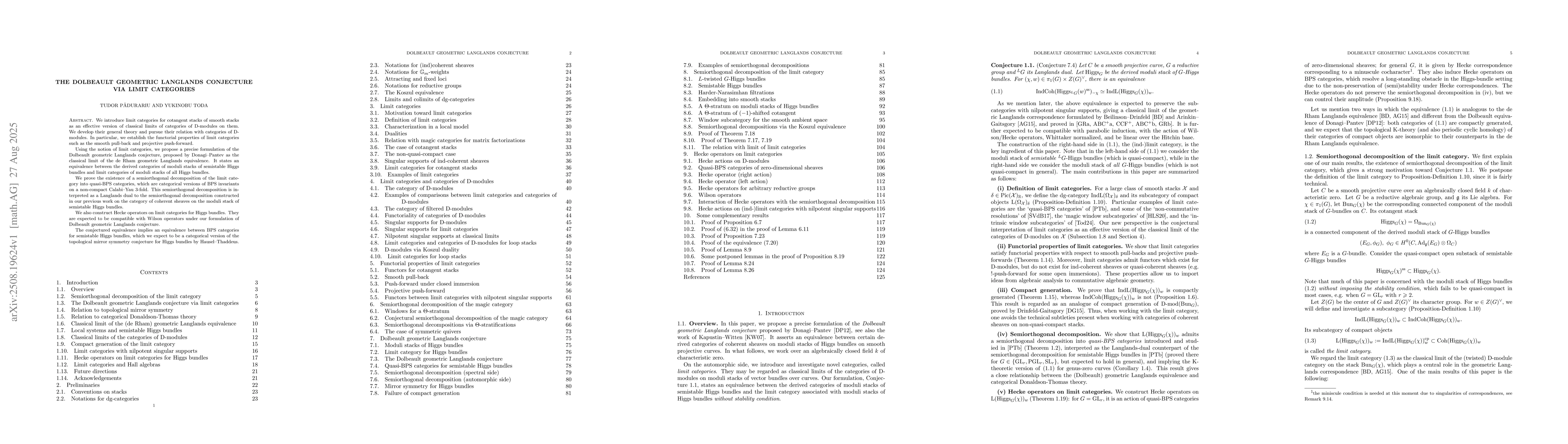 We introduce limit categories for cotangent stacks of smooth stacks as an effective version of classical limits of categories of D-modules on them. We develop their general theory and pursue their relation with categories of D-modules. In particular, we establish the functorial properties of limit categories such as the smooth pull-back and projective push-forward. Using the notion of limit categories, we propose a precise formulation of the Dolbeault geometric Langlands conjecture, proposed by Donagi-Pantev as the classical limit of the de Rham geometric Langlands equivalence. It states an equivalence between the derived categories of moduli stacks of semistable Higgs bundles and limit categories of moduli stacks of all Higgs bundles. We prove the existence of a semiorthogonal decomposition of the limit category into quasi-BPS categories, which are categorical versions of BPS invariants on a non-compact Calabi-Yau 3-fold. This semiorthogonal decomposition is interpreted as a Langlands dual to the semiorthogonal decomposition constructed in our previous work on the category of coherent sheaves on the moduli stack of semistable Higgs bundles. We also construct Hecke operators on limit categories for Higgs bundles. They are expected to be compatible with Wilson operators under our formulation of Dolbeault geometric Langlands conjecture. The conjectured equivalence implies an equivalence between BPS categories for semistable Higgs bundles, which we expect to be a categorical version of the topological mirror symmetry conjecture for Higgs bundles by Hausel-Thaddeus.