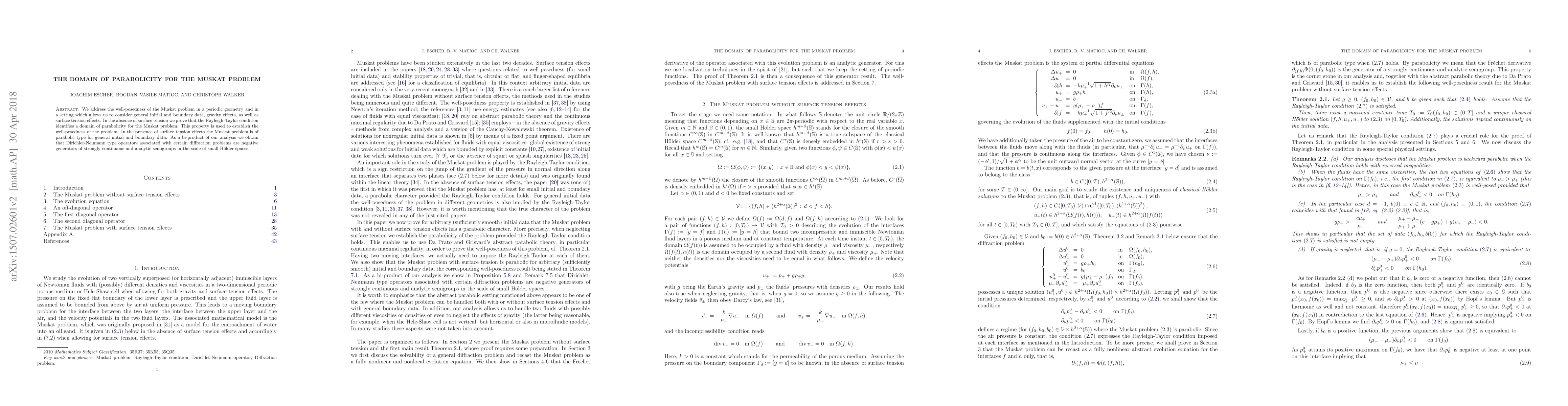Researchers prove that the Muskat problem has a domain of parabolicity, which ensures its well-posedness in various settings, including with gravity effects and surface tension.