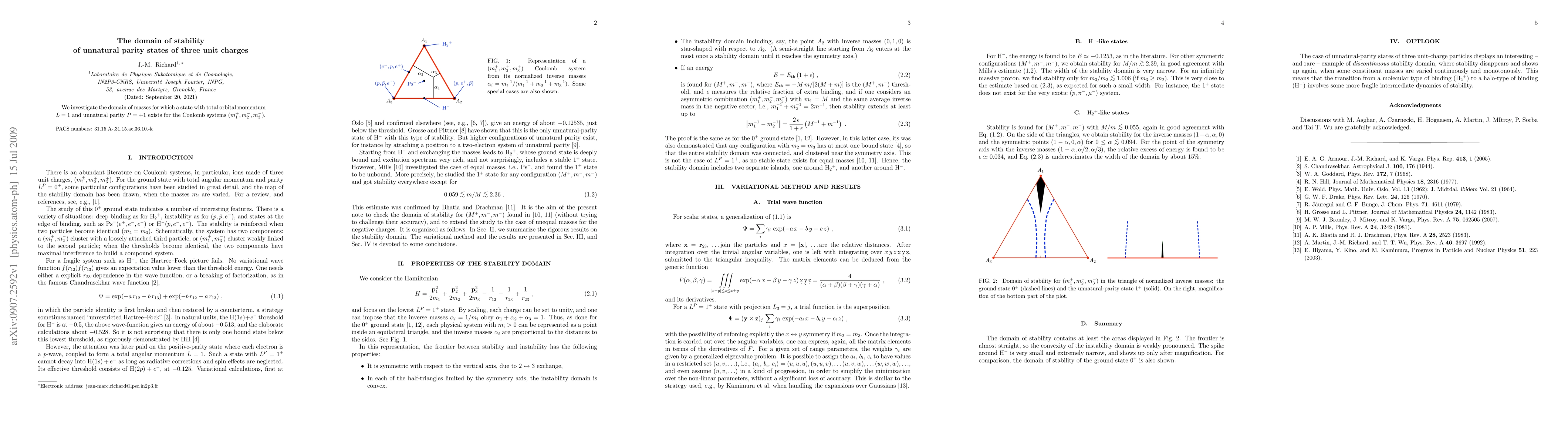 We investigate the domain of masses for which a state with total orbital momentum L=1 and unnatural parity $P=+1$ exists for the Coulomb systems $(m_1^+,m_2^-,m_3^-)$.