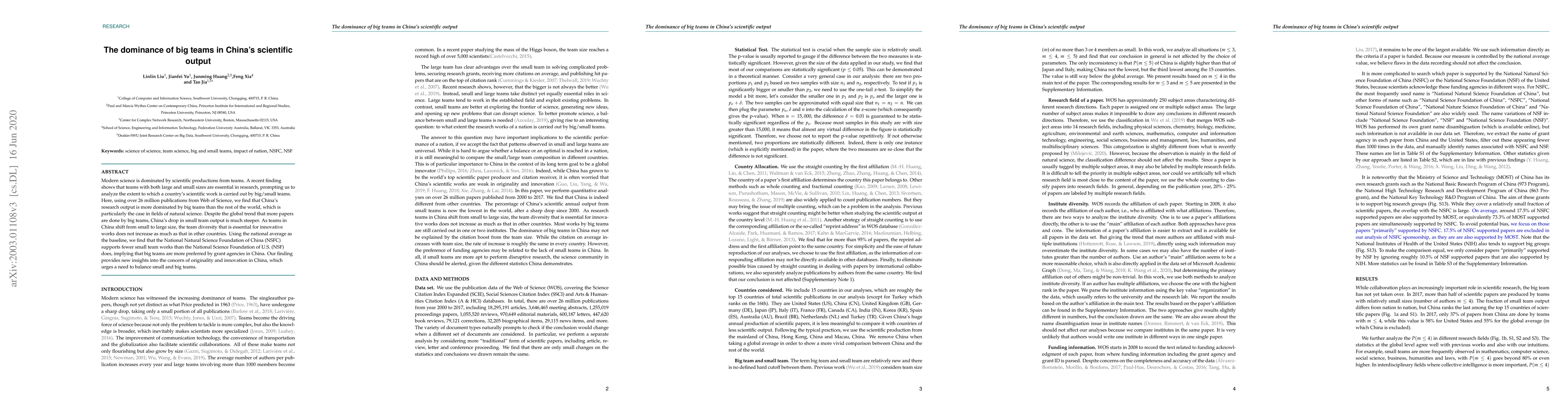 Modern science is dominated by scientific productions from teams. A recent finding shows that teams with both large and small sizes are essential in research, prompting us to analyze the extent to which a country's scientific work is carried out by big/small teams. Here, using over 26 million publications from Web of Science, we find that China's research output is more dominated by big teams than the rest of the world, which is particularly the case in fields of natural science. Despite the global trend that more papers are done by big teams, China's drop in small team output is much steeper. As teams in China shift from small to large size, the team diversity that is essential for innovative works does not increase as much as that in other countries. Using the national average as the baseline, we find that the National Natural Science Foundation of China (NSFC) supports fewer small team works than the National Science Foundation of U.S. (NSF) does, implying that big teams are more preferred by grant agencies in China. Our finding provides new insights into the concern of originality and innovation in China, which urges a need to balance small and big teams.