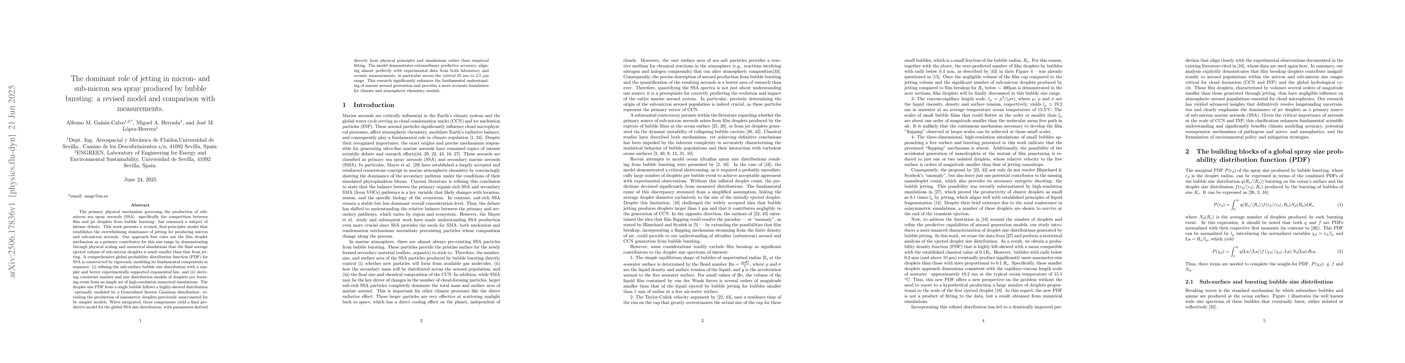 The primary physical mechanism governing the production of sub-micron sea spray aerosols (SSA) -- specifically the competition between film and jet droplets from bubble bursting -- has remained a subject of intense debate. This work presents a revised, first-principles model that establishes the overwhelming dominance of jetting for producing micron and sub-micron aerosols. Our approach first rules out the film droplet mechanism as a primary contributor for this size range by demonstrating through physical scaling and numerical simulations that the final average ejected volume of sub-micron droplets is much smaller than that from jetting. A comprehensive global probability distribution function (PDF) for SSA is constructed by rigorously modeling its fundamental components in sequence: (i) refining the sub-surface bubble size distribution with a simpler and better experimentally supported exponential law, and (ii) deriving consistent number and size distribution models of droplets per bursting event from an ample set of high-resolution numerical simulations. The droplet size PDF from a single bubble follows a highly-skewed distribution -- optimally modeled by a Generalized Inverse Gaussian distribution -- revealing the production of nanometric droplets previously unaccounted for by simpler models. When integrated, these components yield a final predictive model for the global SSA size distribution, with parameters derived directly from physical principles and simulations rather than empirical fitting. The model demonstrates extraordinary predictive accuracy, aligning almost perfectly with experimental data from both laboratory and oceanic measurements, in particular across the critical 25 nm to 2.5 $\mu$m range. This research significantly enhances the fundamental understanding of marine aerosol generation and provides a more accurate foundation for climate and atmospheric chemistry models.