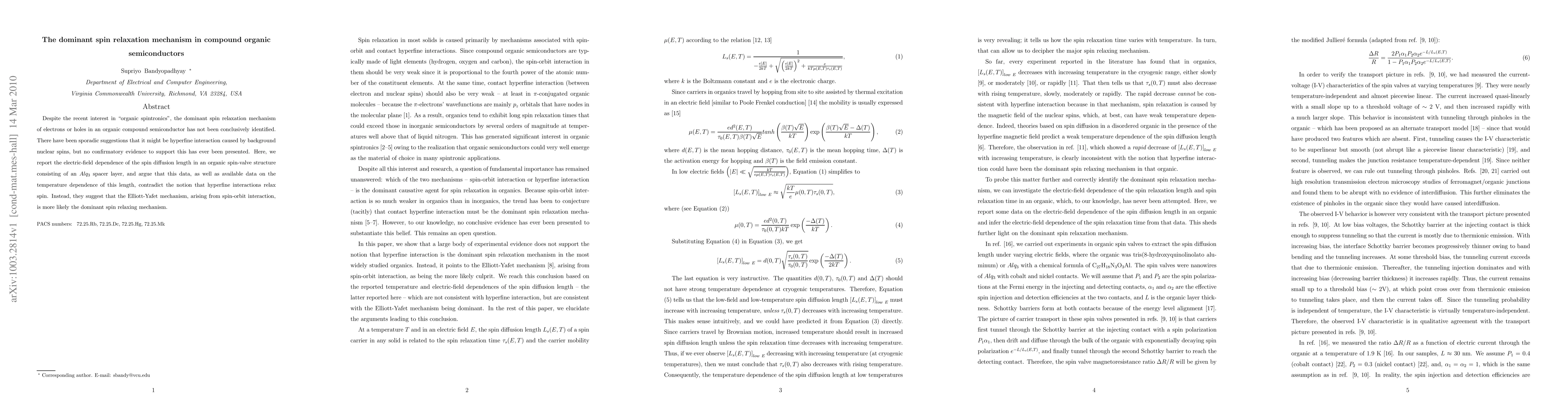 This research identifies the dominant spin relaxation mechanism in organic compound semiconductors, challenging the hypothesis of hyperfine interaction. Data from an Alq3 spin-valve structure suggest that the Elliott-Yafet mechanism, driven by spin-orbit interaction, is more likely responsible for spin relaxation.