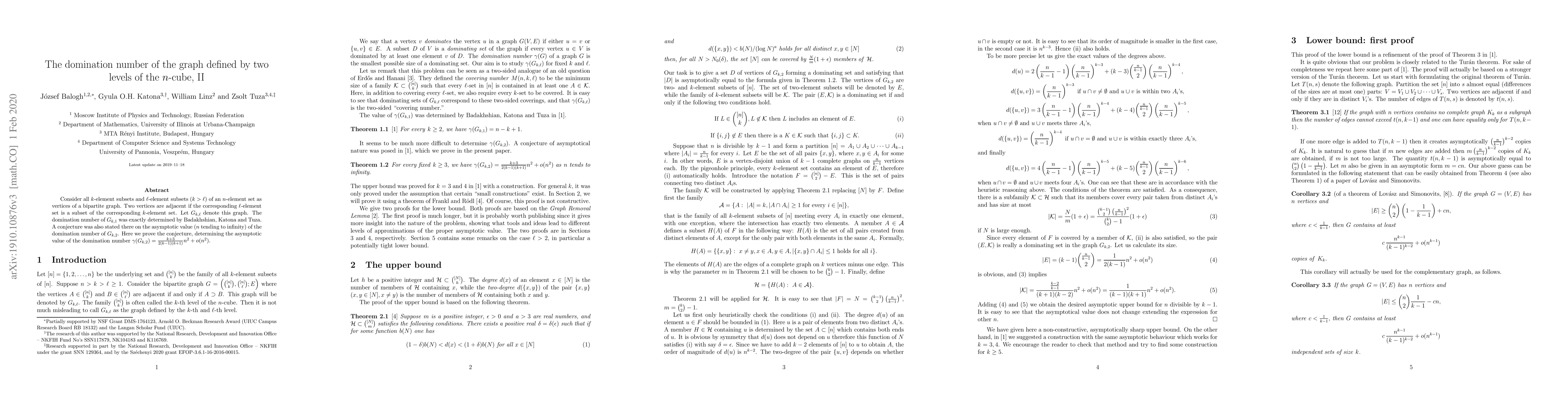 Consider all $k$-element subsets and $\ell$-element subsets $(k>\ell )$ of an $n$-element set as vertices of a bipartite graph. Two vertices are adjacent if the corresponding $\ell$-element set is a subset of the corresponding $k$-element set. Let $G_{k,\ell}$ denote this graph. The domination number of $G_{k,1}$ was exactly determined by Badakhshian, Katona and Tuza. A conjecture was also stated there on the asymptotic value ($n$ tending to infinity) of the domination number of $G_{k,2}$. Here we prove the conjecture, determining the asymptotic value of the domination number $\gamma (G_{k,2})={k+3\over 2(k-1)(k+1)}n^2+o(n^2)$.