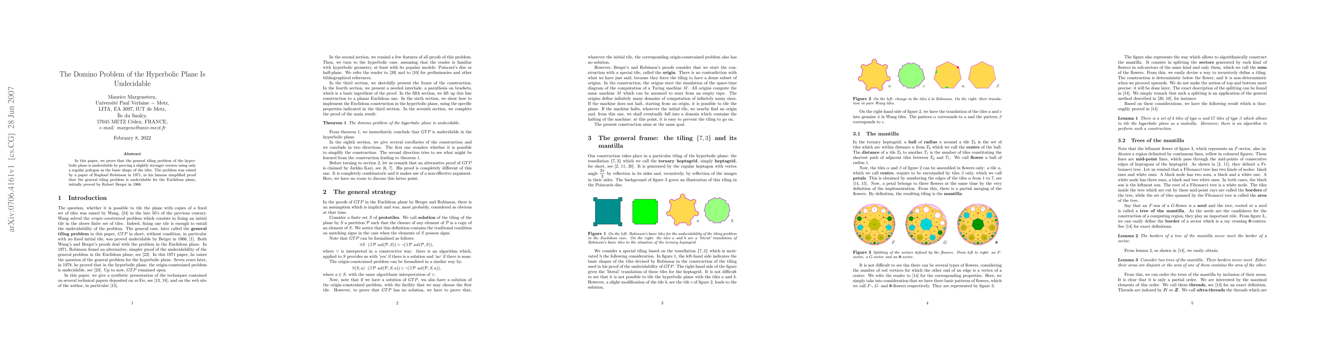 The paper proves the undecidability of the domino problem in the hyperbolic plane using a slightly stronger version with regular polygon tiles as basic shapes, building on Robinson's 1971 work and Berger's 1966 undecidability proof for the Euclidean plane.