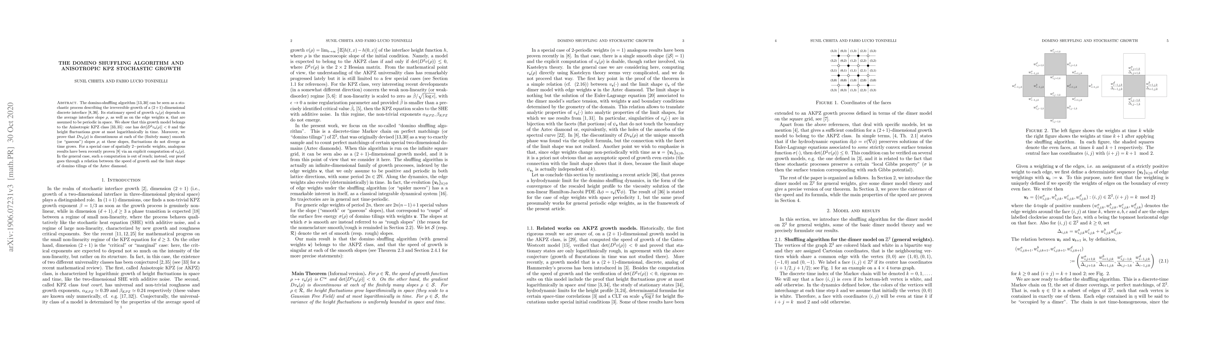 This paper shows that a specific growth model, known as the domino-shuffling algorithm, belongs to the Anisotropic KPZ class of stochastic models, which describes how interfaces grow in certain conditions. The study establishes key properties about the speed of growth and fluctuations at different slopes.