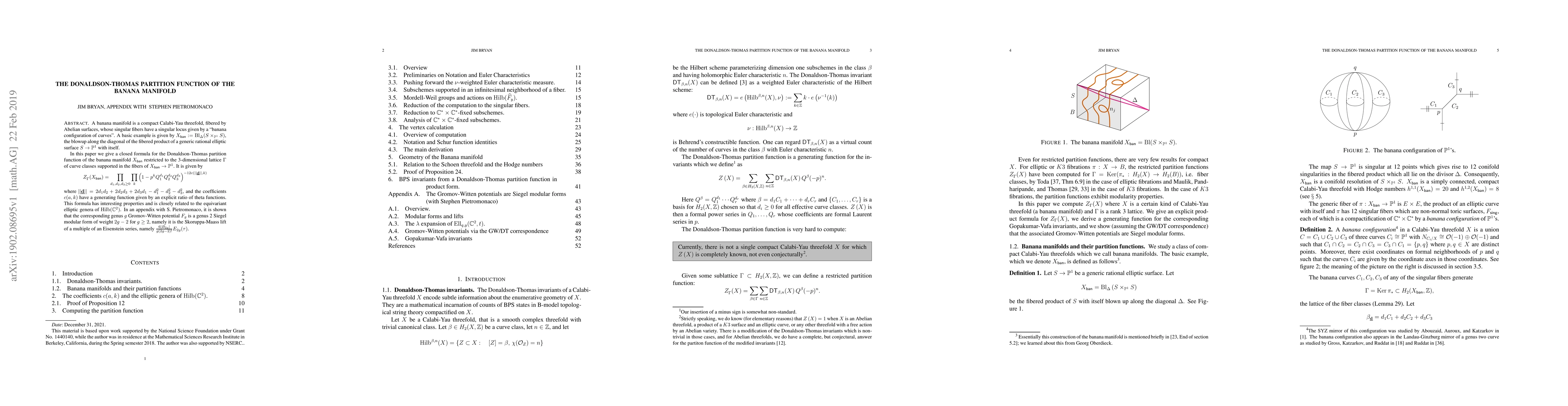This paper presents a closed formula for the Donaldson-Thomas partition function of the banana manifold $X_{ban}$, revealing a relationship with equivariant elliptic genera and Siegel modular forms, with implications for genus $g$ Gromov-Witten potentials.