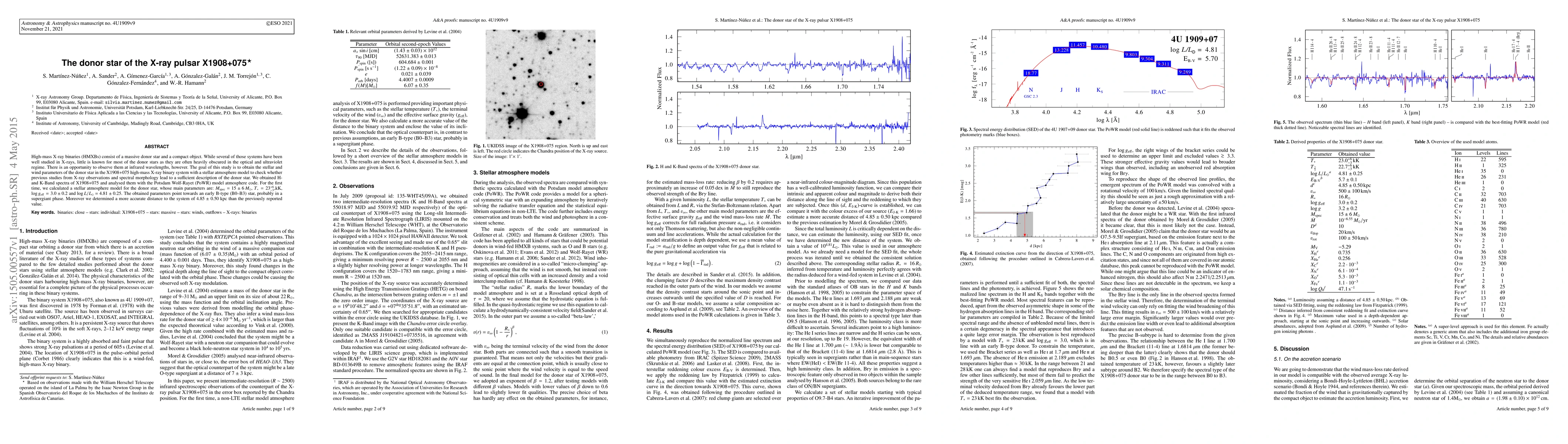 High-mass X-ray binaries (HMXBs) consist of a massive donor star and a compact object. While several of those systems have been well studied in X-rays, little is known for most of the donor stars as they are often heavily obscured in the optical and ultraviolet regime. There is an opportunity to observe them at infrared wavelengths, however. The goal of this study is to obtain the stellar and wind parameters of the donor star in the X1908+075 high-mass X-ray binary system with a stellar atmosphere model to check whether previous studies from X-ray observations and spectral morphology lead to a sufficient description of the donor star. We obtained H- and K-Band spectra of X1908+075 and analysed them with the Potsdam Wolf-Rayet (PoWR) model atmosphere code. For the first time, we calculated a stellar atmosphere model for the donor star, whose main parameters are: $M_{\mathrm{spec}}$ = $15 \pm 6$$M_{\odot}$, $T_{\ast} = 23_{-3}^{+6},$kK, $\log g_\mathrm{eff} = 3.0 \pm 0.2$ and $\log L/L_{\odot}$ = $4.81 \pm 0.25$. The obtained parameters point towards an early B-type (B0--B3) star, probably in a supergiant phase. Moreover we determined a more accurate distance to the system of 4.85 $\pm$ 0.50 kpc than the previously reported value.