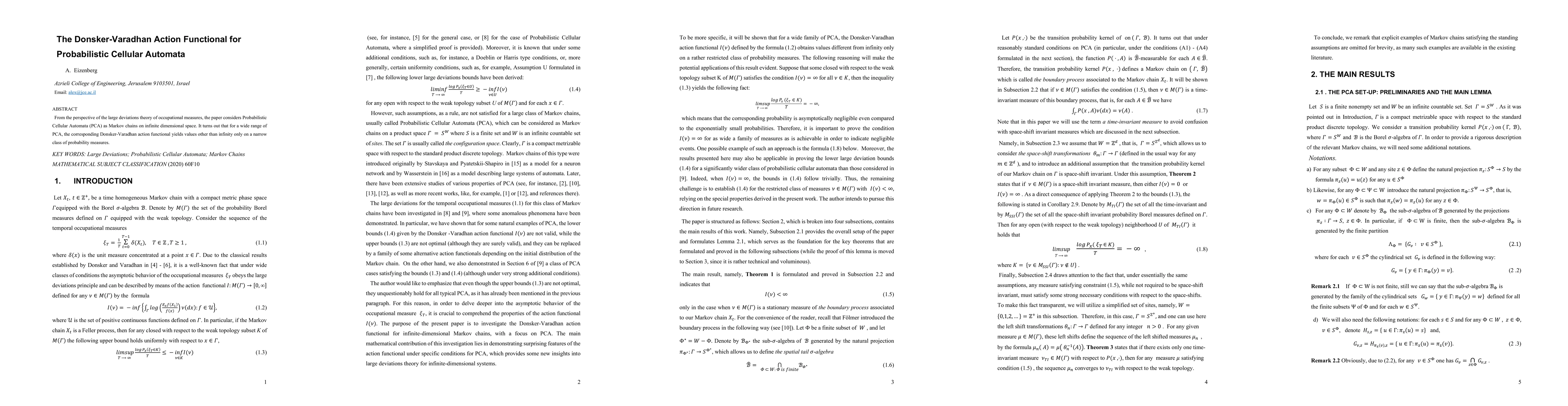 From the perspective of the large deviations theory of occupational measures, the paper considers Probabilistic Cellular Automata (PCA) as Markov chains on infinite dimensional space. It turns out that for a wide range of PCA, the corresponding Donsker-Varadhan action functional yields values other than infinity only on a narrow class of probability measures.