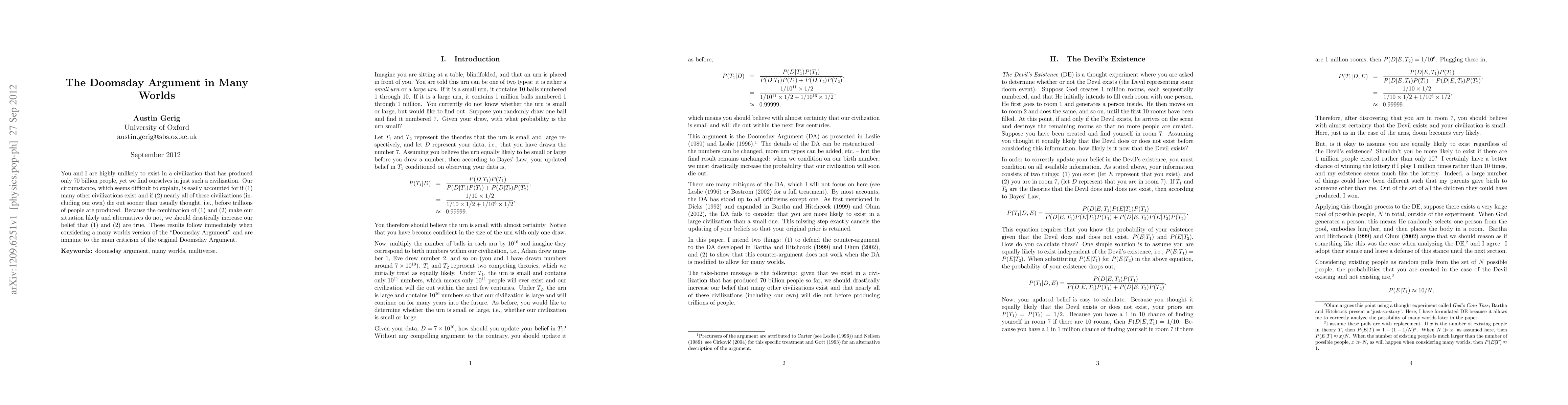 The paper explores a many-worlds interpretation of the Doomsday Argument, suggesting that our existence in a small civilization is more likely if many civilizations exist and most die out early, rather than continuing to produce trillions of people. This interpretation counters the original Doomsday Argument's main criticisms.