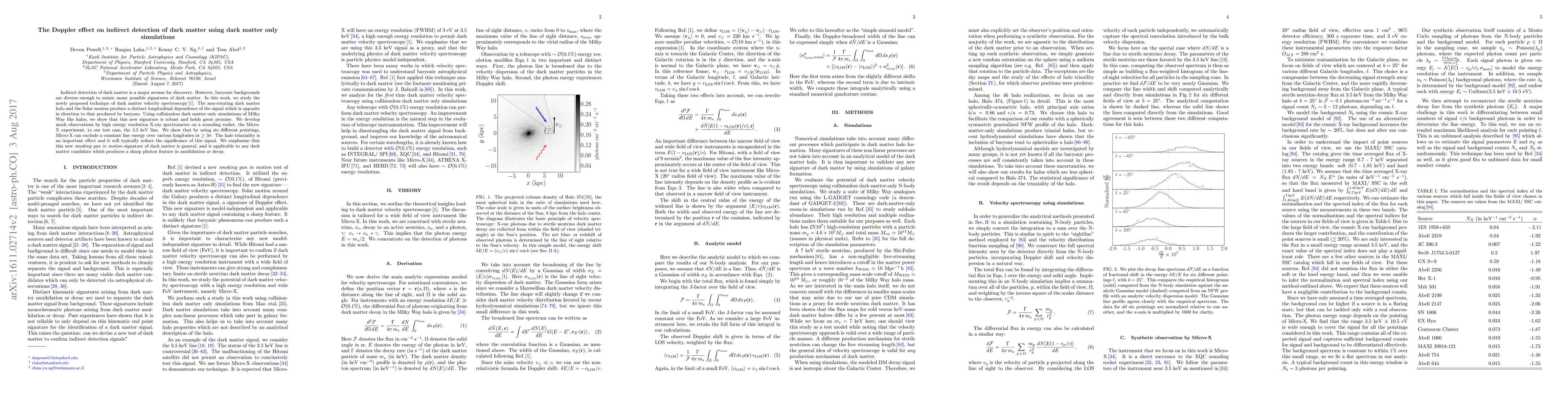 This paper explores the Doppler effect in dark matter velocity spectroscopy for indirect dark matter detection, demonstrating that the non-rotating dark matter halo and Solar motion create a distinct longitudinal signal opposite to baryonic backgrounds. Using dark matter-only simulations, the authors show this signature is robust and can be detected using the Micro-X experiment, highlighting its general applicability to any dark matter candidate with a sharp photon feature.