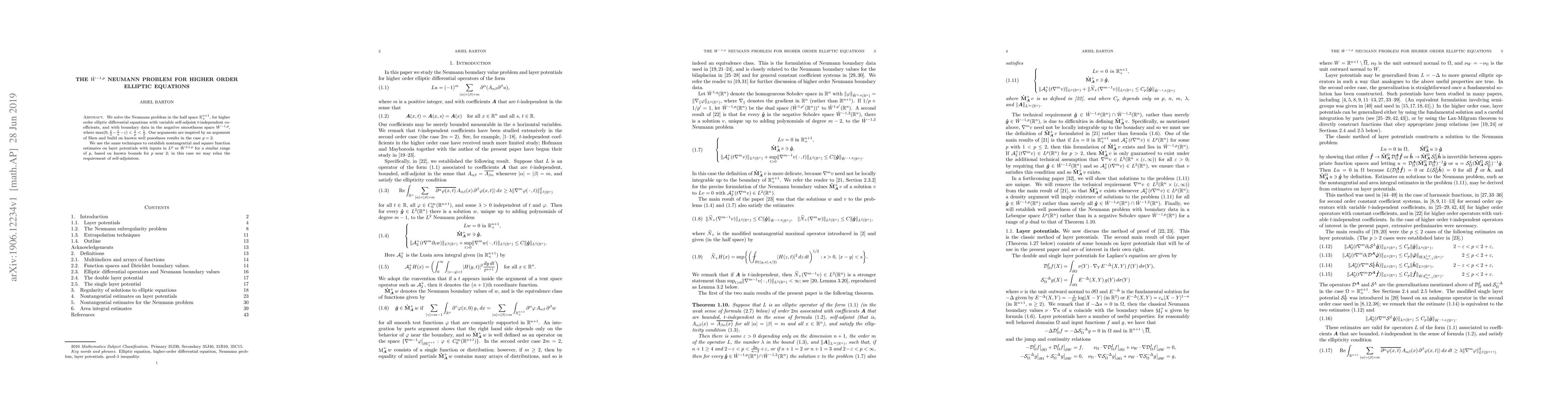 This paper addresses the Neumann problem for higher-order elliptic equations in the half space $\mathbb{R}^{n+1}_+$, solving it with boundary data in the negative smoothness space $\dot W^{-1,p}$. The authors leverage techniques inspired by Shen to establish nontangential and square function estimates on layer potentials, relaxing the requirement of self-adjointness for certain $p$ values.