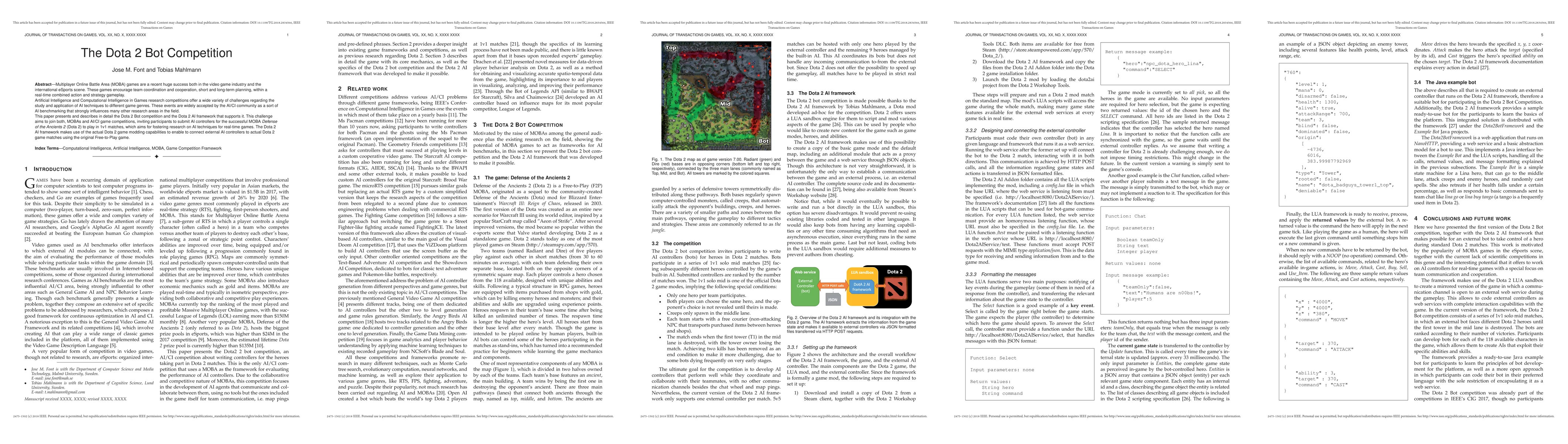 Multiplayer Online Battle Area (MOBA) games are a recent huge success both in the video game industry and the international eSports scene. These games encourage team coordination and cooperation, short and long-term planning, within a real-time combined action and strategy gameplay. Artificial Intelligence and Computational Intelligence in Games research competitions offer a wide variety of challenges regarding the study and application of AI techniques to different game genres. These events are widely accepted by the AI/CI community as a sort of AI benchmarking that strongly influences many other research areas in the field. This paper presents and describes in detail the Dota 2 Bot competition and the Dota 2 AI framework that supports it. This challenge aims to join both, MOBAs and AI/CI game competitions, inviting participants to submit AI controllers for the successful MOBA \textit{Defense of the Ancients 2} (Dota 2) to play in 1v1 matches, which aims for fostering research on AI techniques for real-time games. The Dota 2 AI framework makes use of the actual Dota 2 game modding capabilities to enable to connect external AI controllers to actual Dota 2 game matches using the original Free-to-Play game.se of the actual Dota 2 game modding capabilities to enable to connect external AI controllers to actual Dota 2 game matches using the original Free-to-Play game.