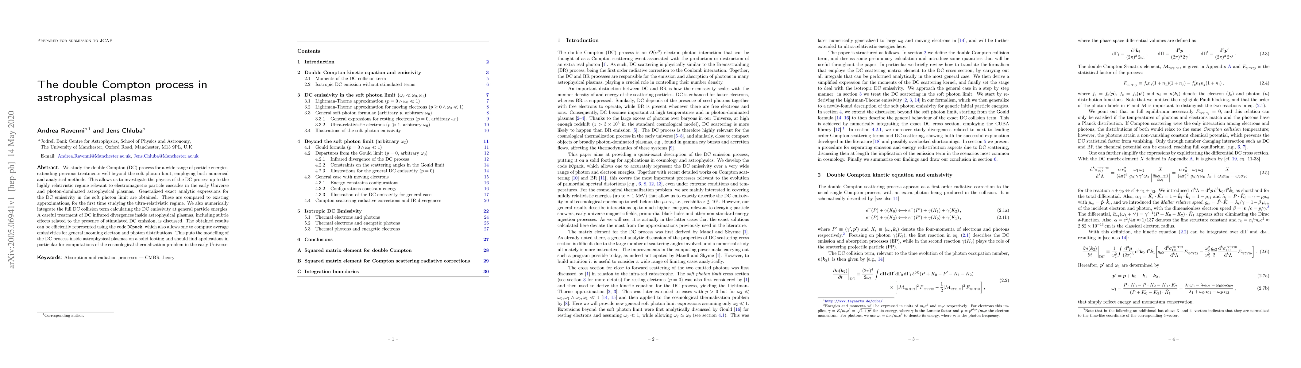 This paper investigates the double Compton process in astrophysical plasmas, providing generalized exact analytic expressions and numerical methods for the DC emissivity across a wide range of relativistic regimes. The study addresses infrared divergences and stimulated emission effects, offering a robust computational tool for modeling the DC process in cosmological contexts.