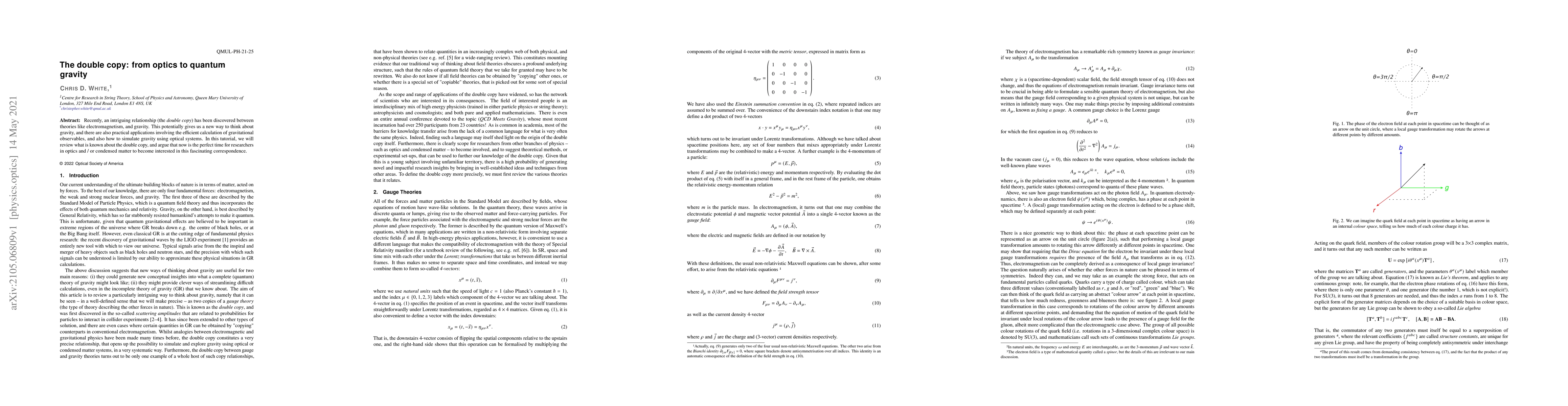 Recently, an intriguing relationship (the "double copy") has been discovered between theories like electromagnetism, and gravity. This potentially gives us a new way to think about gravity, and there are also practical applications involving the efficient calculation of gravitational observables, and also how to simulate gravity using optical systems. In this tutorial, we will review what is known about the double copy, and argue that now is the perfect time for researchers in optics and / or condensed matter to become interested in this fascinating correspondence.