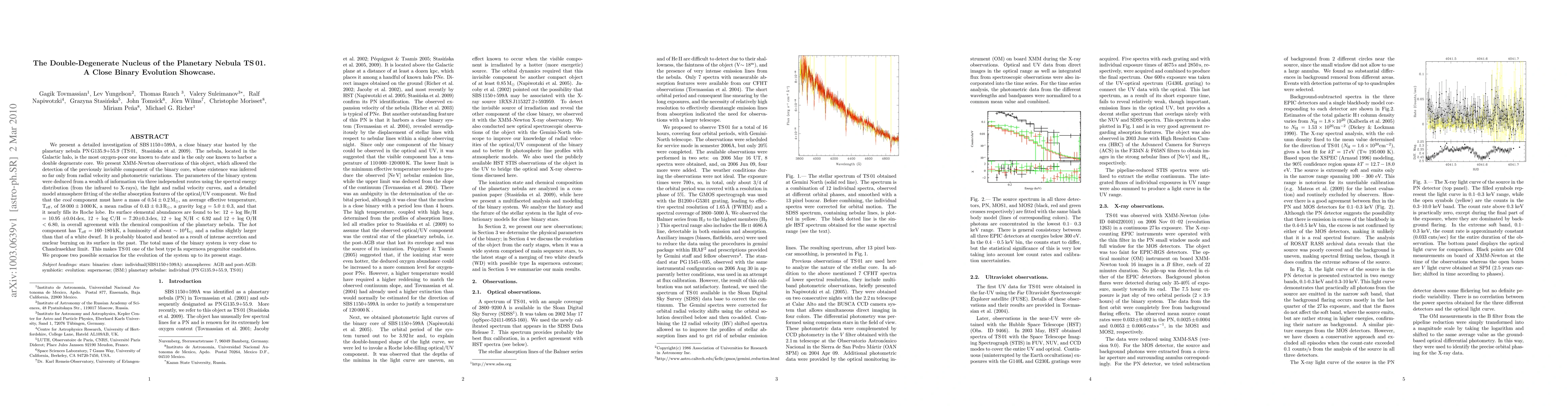 We present a detailed investigation of SBS1150+599A, a close binary star hosted by the planetary nebula PN G135.9+55.9 (TS01, Stasinska et al, 2009). The nebula, located in the Galactic halo, is the most oxygen-poor one known to date and is the only one known to harbor a double degenerate core. We present XMM-Newton observations of this object, which allowed the detection of the previously invisible component of the binary core, whose existence was inferred so far only from radial velocity and photometric variations. The parameters of the binary system were deduced from a wealth of information via three independent routes using the spectral energy distribution (from the infrared to X-rays), the light and radial velocity curves, and a detailed model atmosphere fitting of the stellar absorption features of the optical/UV component. We find that the cool component must have a mass of 0.54+/-0.2 Msun, an average effective temperature, Teff, of 58000+/-3000 K, a mean radius of 0.43+/-0.3 Rsun, a gravity log g=5.0+/-0.3, and that it nearly fills its Roche lobe. Its surface elemental abundances are found to be: 12 + log He/H = 10.95+/-0.04 dex, 12 + log C/H = 7.20+/-0.3 dex, 12 + log N/H < 6.92 and 12 + log O/H < 6.80, in overall agreement with the chemical composition of the planetary nebula. The hot component has Teff = 160-180 kK, a luminosity of about ~10e4 Lsun and a radius slightly larger than that of a white dwarf. It is probably bloated and heated as a result of intense accretion and nuclear burning on its surface in the past. The total mass of the binary system is very close to Chandrasekhar limit. This makes TS01 one of the best type Ia supernova progenitor candidates. We propose two possible scenarios for the evolution of the system up to its present stage.