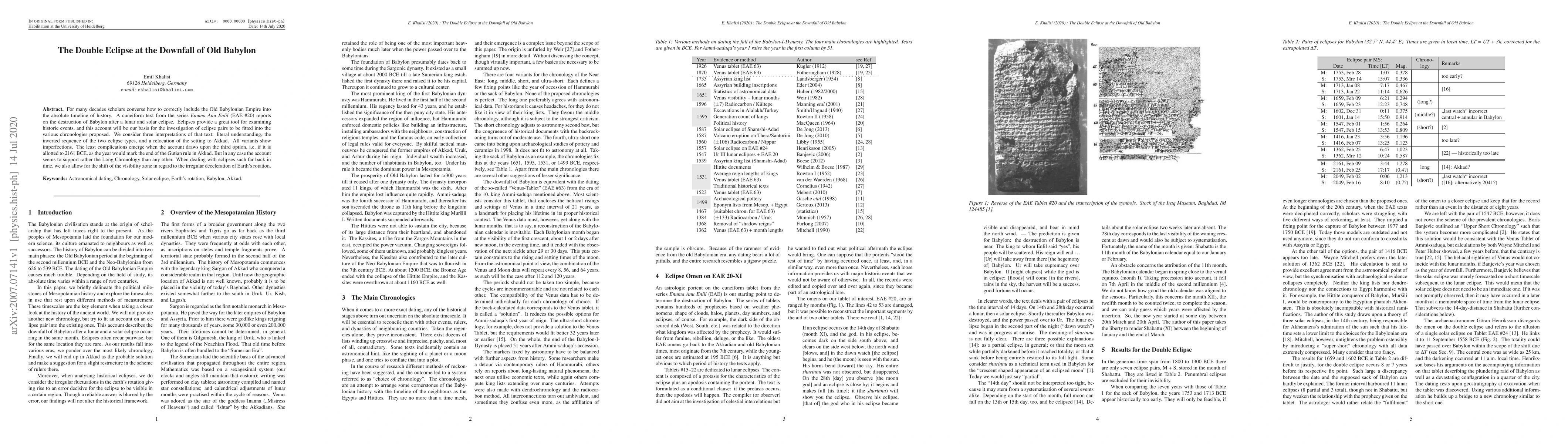 For many decades scholars converse how to correctly include the Old Babylonian Empire into the absolute timeline of history. A cuneiform text from the series Enuma Anu Enlil (EAE #20) reports on the destruction of Babylon after a lunar and solar eclipse. Eclipses provide a great tool for examining historic events, and this account will be our basis for the investigation of eclipse pairs to be fitted into the various chronologies proposed. We consider three interpretations of that text: literal understanding, the inverted sequence of the two eclipse types, and a relocation of the setting to Akkad. All variants show imperfections. The least complications emerge when the account draws upon the third option, i.e. if it is allotted to 2161 BCE, as the year would mark the end of the Gutian rule in Akkad. But in any case the account seems to support rather the Long Chronology than any other. When dealing with eclipses such far back in time, we also allow for the shift of the visibility zone in regard to the irregular deceleration of Earth's rotation.