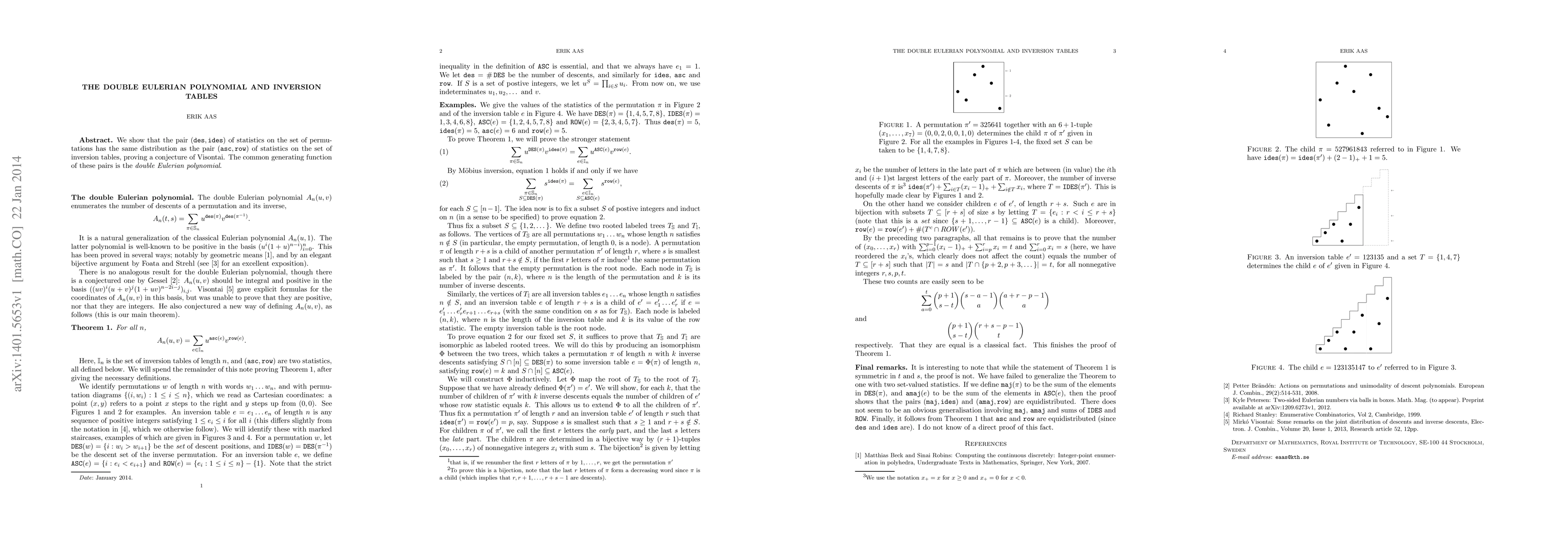This paper proves a conjecture by Visontai, demonstrating that the statistics (des, ides) on permutations and (asc, row) on inversion tables have identical distributions. The common generating function for these pairs is identified as the double Eulerian polynomial.