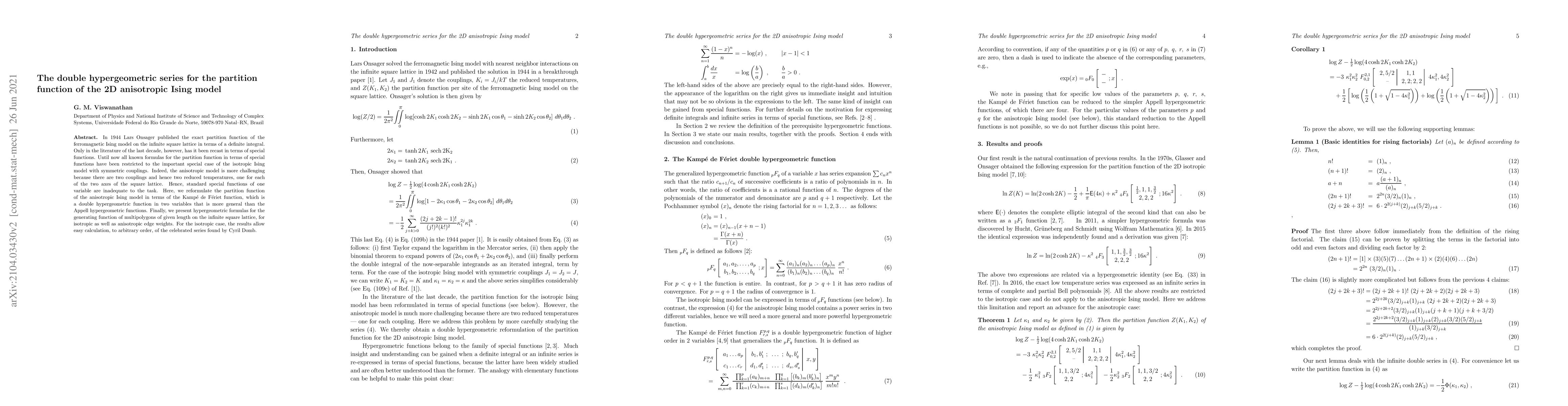 In 1944 Lars Onsager published the exact partition function of the ferromagnetic Ising model on the infinite square lattice in terms of a definite integral. Only in the literature of the last decade, however, has it been recast in terms of special functions. Until now all known formulas for the partition function in terms of special functions have been restricted to the important special case of the isotropic Ising model with symmetric couplings. Indeed, the anisotropic model is more challenging because there are two couplings and hence two reduced temperatures, one for each of the two axes of the square lattice. Hence, standard special functions of one variable are inadequate to the task. Here, we reformulate the partition function of the anisotropic Ising model in terms of the Kamp\'e de F\'eriet function, which is a double hypergeometric function in two variables that is more general than the Appell hypergeometric functions. Finally, we present hypergeometric formulas for the generating function of multipolygons of given length on the infinite square lattice, for isotropic as well as anisotropic edge weights. For the isotropic case, the results allow easy calculation, to arbitrary order, of the celebrated series found by Cyril Domb.