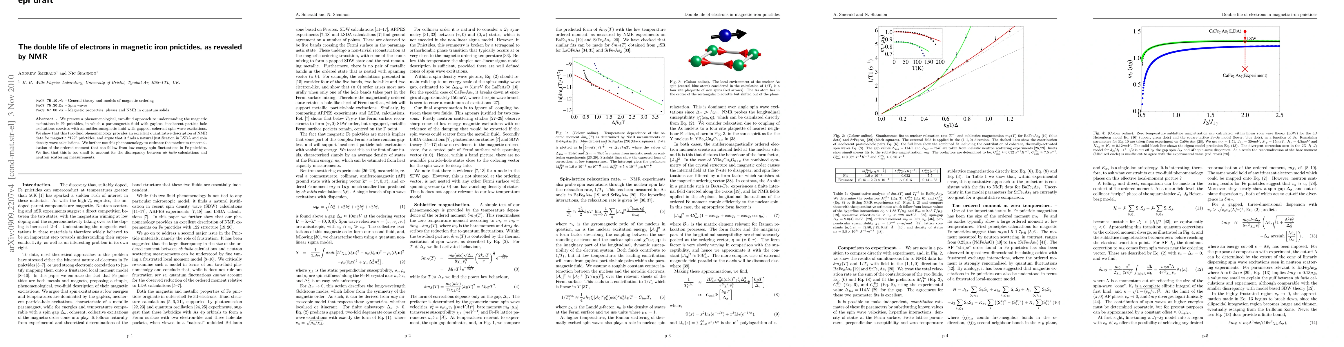 We present a phenomenological, two-fluid approach to understanding the magnetic excitations in Fe pnictides, in which a paramagnetic fluid with gapless, incoherent particle-hole excitations coexists with an antiferromagnetic fluid with gapped, coherent spin wave excitations. We show that this two-fluid phenomenology provides an excellent quantitative description of NMR data for magnetic "122" pnictides, and argue that it finds a natural justification in LSDA and spin density wave calculations. We further use this phenomenology to estimate the maximum renormalisation of the ordered moment that can follow from low-energy spin fluctuations in Fe pnictides. We find that this is too small to account for the discrepancy between ab intio calculations and neutron scattering measurements.