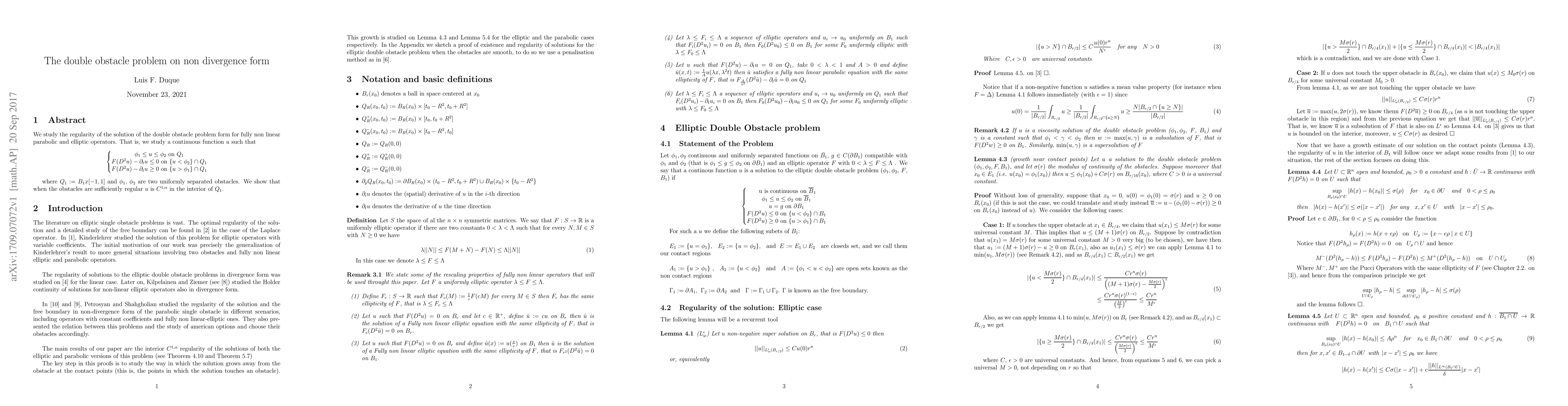 We study the regularity of the solution of the double obstacle problem form for fully non linear parabolic and elliptic operators. We show that when the obstacles are sufficiently regular the solution is $C^{1,\alpha}$ in the interior for both the parabolic and the elliptic cases.