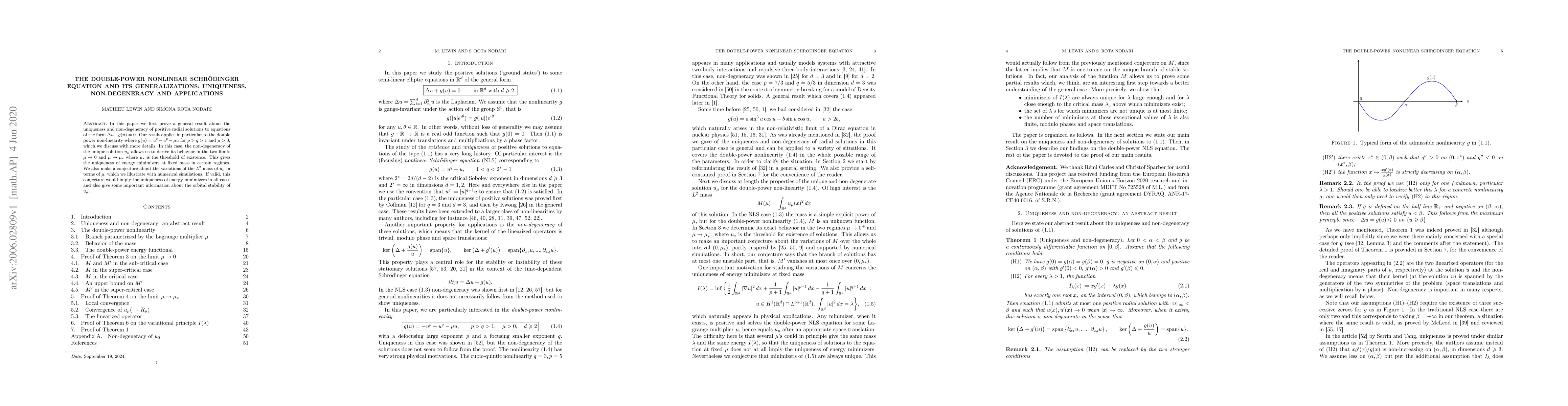 The paper proves uniqueness and non-degeneracy of solutions to a nonlinear Schrödinger equation with double power non-linearity, leading to insights into energy minimizers and orbital stability.