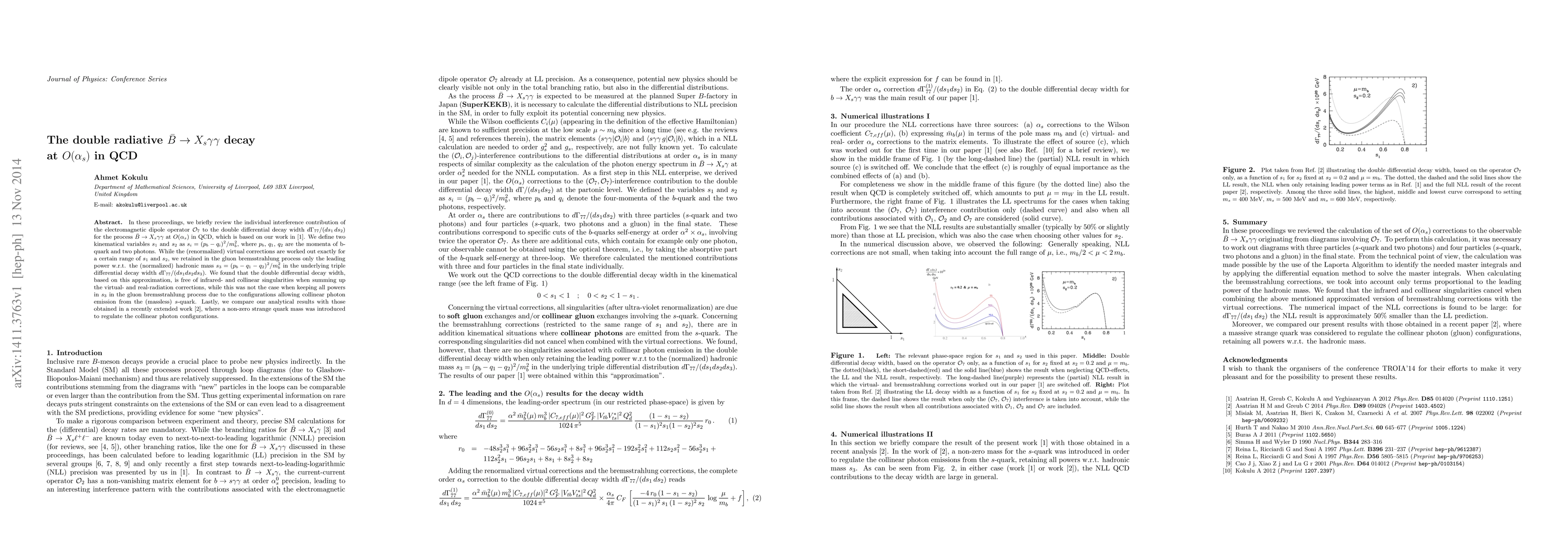 In these proceedings, we briefly review the individual interference contribution of the electromagnetic dipole operator $\mathcal{O}_{7}$ to the double differential decay width $d\Gamma_{77}/(ds_1\, ds_2)$ for the process $\bar{B} \to X_s \gamma \gamma$ at $O(\alpha_s)$ in QCD, which is based on our previous work. We define two kinematical variables $s_1$ and $s_2$ as $s_i=(p_b - q_i)^2/m_b^2$, where $p_b$, $q_1$, $q_2$ are the momenta of b-quark and two photons. While the (renormalized) virtual corrections are worked out exactly for a certain range of $s_1$ and $s_2$, we retained in the gluon bremsstrahlung process only the leading power w.r.t. the (normalized) hadronic mass $s_3=(p_b-q_1-q_2)^2/m_b^2$ in the underlying triple differential decay width $d\Gamma_{77}/(ds_1 ds_2 ds_3)$. We found that the double differential decay width, based on this approximation, is free of infrared- and collinear singularities when summing up the virtual- and real-radiation corrections, while this was not the case when keeping all powers in $s_3$ in the gluon bremsstrahlung process due to the configurations allowing collinear photon emission from the (massless) $s$-quark. Lastly, we compare our analytical results with those obtained in a recently extended work, where a non-zero strange quark mass was introduced to regulate the collinear photon configurations.