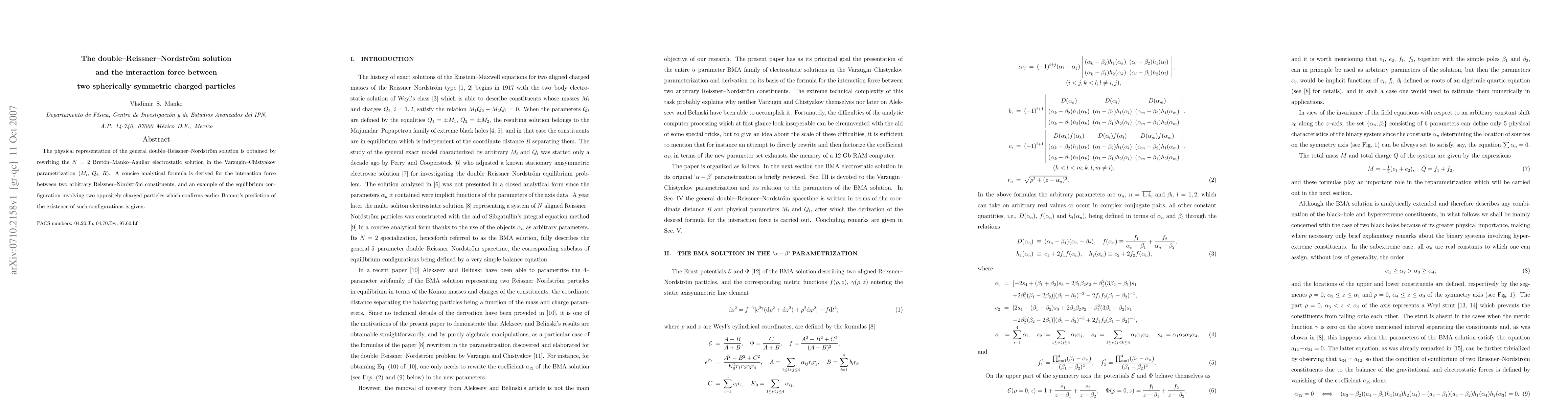This paper derives the general double-Reissner-Nordstrom solution and provides an analytical formula for the interaction force between two charged Reissner-Nordstrom particles, confirming Bonnor's prediction of equilibrium configurations with oppositely charged particles.