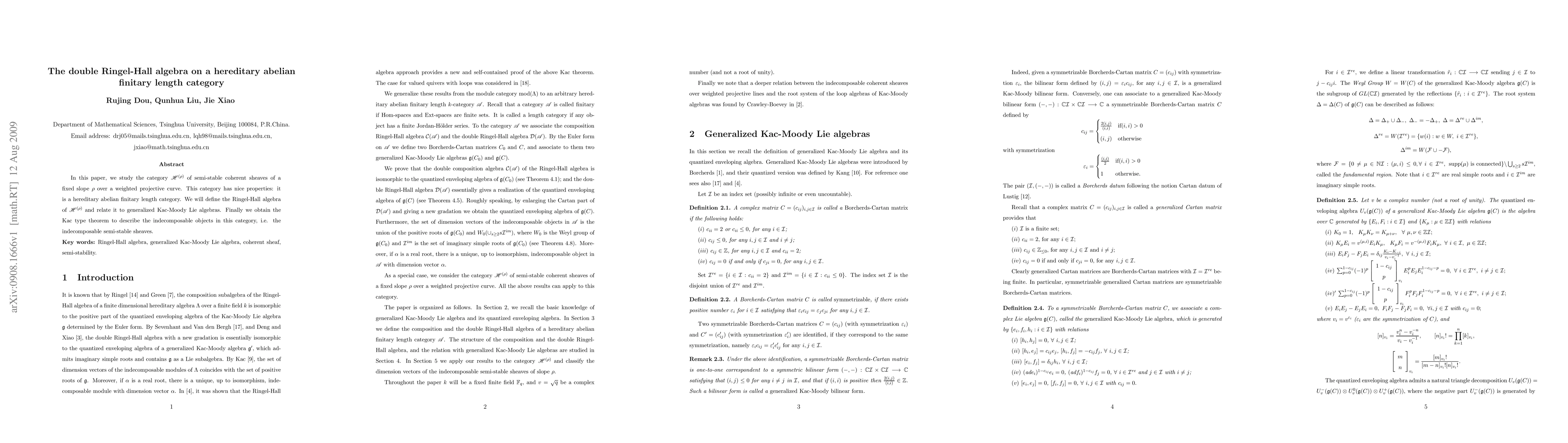 Researchers studied a category of semi-stable coherent sheaves on a weighted projective curve and developed an algebra related to generalized Kac-Moody Lie algebras, obtaining the Kac type theorem for describing indecomposable objects in this category.
