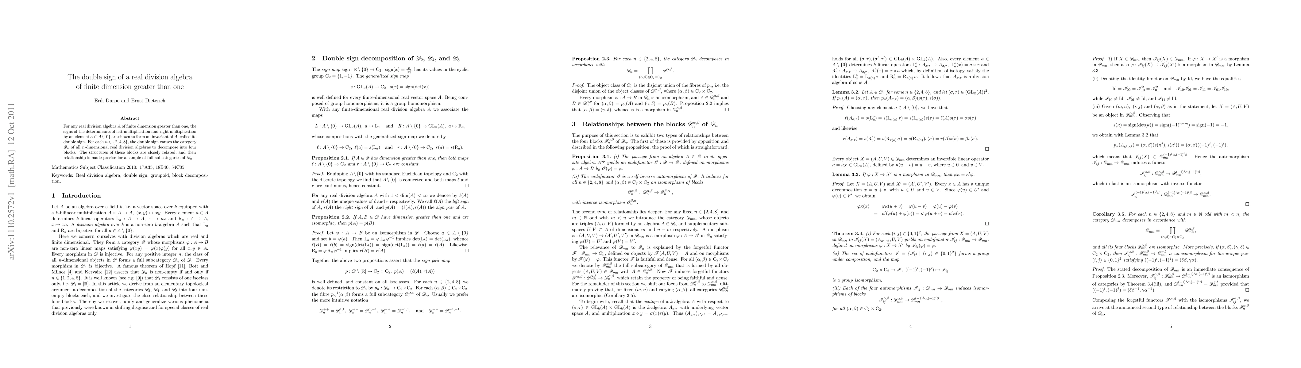 Research shows that real division algebras of finite dimension greater than one have an invariant called their double sign, which categorizes them into four blocks. This discovery has implications for the understanding of these algebraic structures.