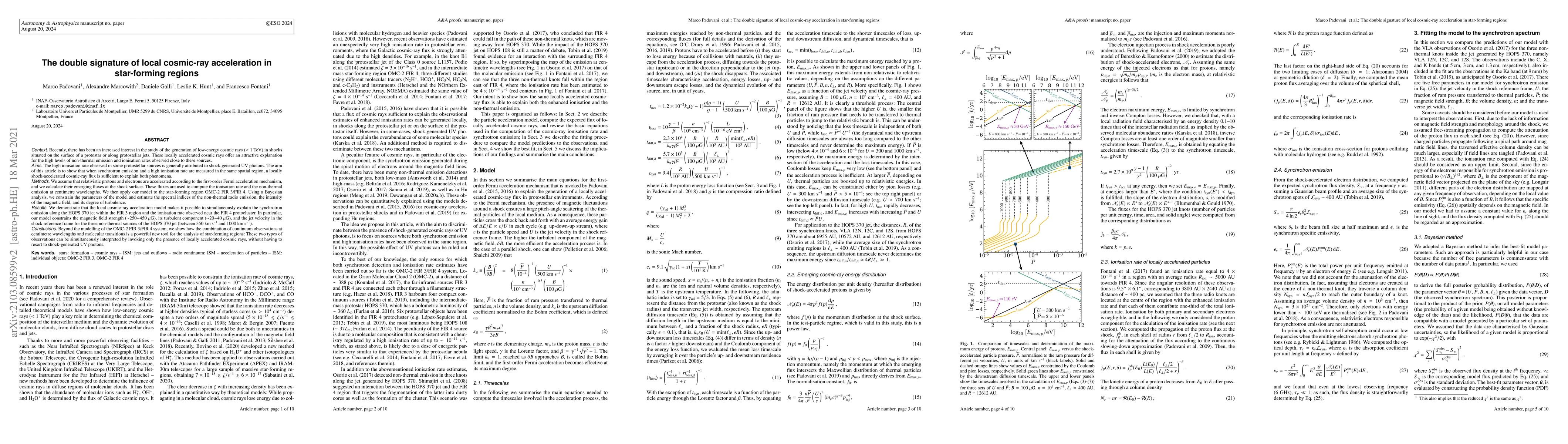 Recently, there has been an increased interest in the study of the generation of low-energy cosmic rays (CRs; < 1 TeV) in shocks situated on the surface of a protostar or along protostellar jets. These locally accelerated CRs offer an attractive explanation for the high levels of non-thermal emission and ionisation rate, $\zeta$, observed close to these sources. The high $\zeta$ observed in some protostellar sources is generally attributed to shock-generated UV photons. The aim of this article is to show that when synchrotron emission and a high $\zeta$ are measured in the same spatial region, a locally shock-accelerated CR flux is sufficient to explain both phenomena. We assume that relativistic particles are accelerated according to the first-order Fermi acceleration mechanism and compute $\zeta$ and the non-thermal emission at cm wavelengths. We then apply our model to the star-forming region OMC-2 FIR 3/FIR 4. Using a Bayesian analysis, we constrain the parameters of the model and estimate the spectral indices of the non-thermal radio emission. We demonstrate that the local CR acceleration model makes it possible to simultaneously explain the synchrotron emission along the HOPS 370 jet within the FIR 3 region and $\zeta$ observed near the FIR 4 protocluster. Our model constrains the magnetic field strength (~250-450$~\mu$G), its turbulent component (~20-40$~\mu$G), and the jet velocity in the shock reference frame for the three non-thermal sources of the HOPS 370 jet (~350-1000 km s$^{-1}$). Beyond the modelling of the OMC-2 FIR 3/FIR 4 system, we show how the combination of continuum observations at cm wavelengths and molecular transitions is a powerful new tool for the analysis of star-forming regions: these two types of observations can be simultaneously interpreted by invoking only the presence of locally accelerated CRs, without having to resort to shock-generated UV photons.