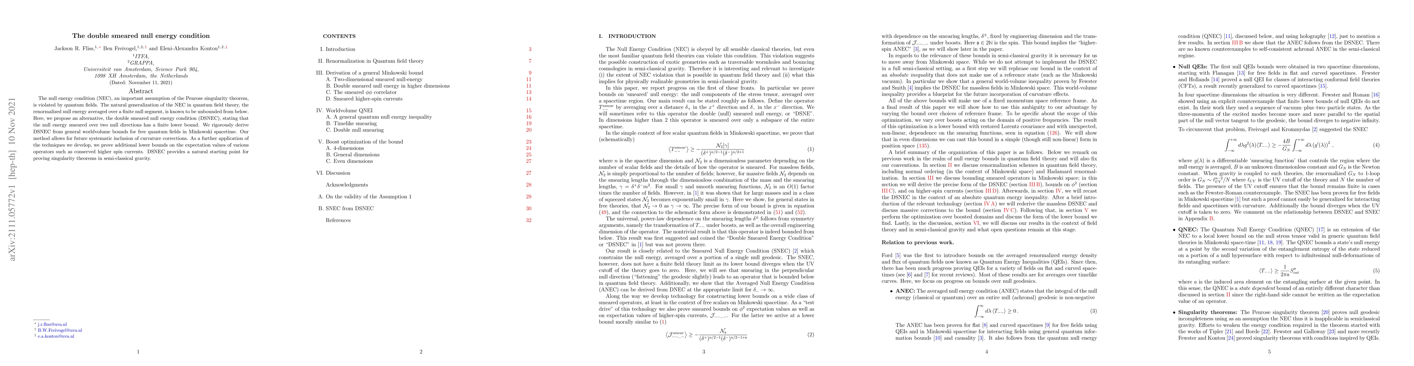 The paper proposes the double smeared null energy condition (DSNEC) as an alternative to the unbounded renormalized null energy condition in quantum field theory, providing a finite lower bound for null energy smeared over two null directions. The authors derive DSNEC rigorously from general worldvolume bounds for free quantum fields and suggest it as a foundation for singularity theorems in semi-classical gravity.