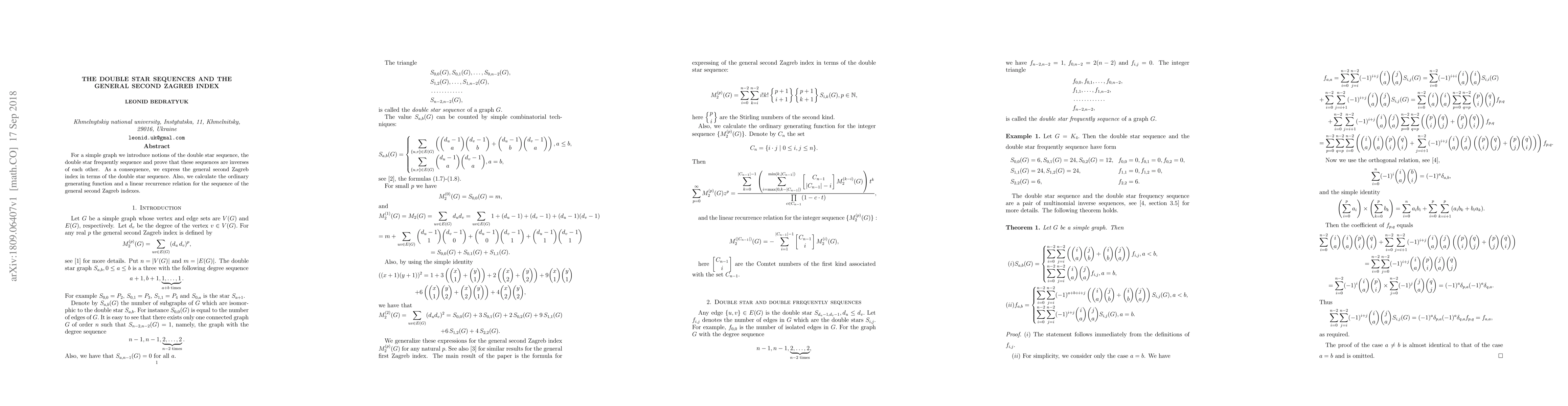 For a simple graph we introduce notions of the double star sequence, the double star frequently sequence and prove that these sequences are inverses of each other. As a consequence, we express the general second Zagreb index in terms of the double star sequence. Also, we calculate the ordinary generating function and a linear recurrence relation for the sequence of the general second Zagreb indexes.