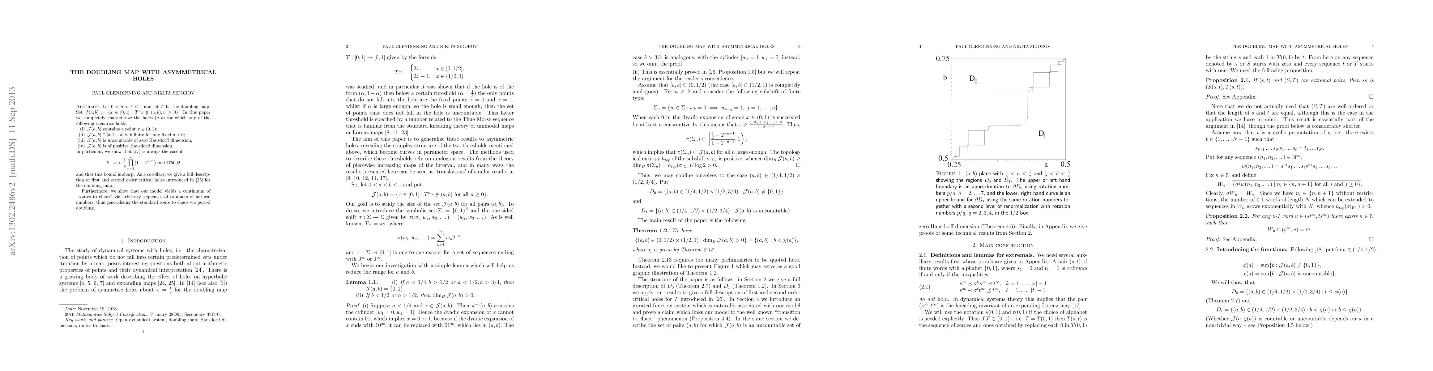 This paper characterizes the conditions under which the doubling map with asymmetrical holes $(a,b)$ exhibits specific properties, such as containing points, infinite intersections, and varying Hausdorff dimensions. It proves that a positive Hausdorff dimension for $\mathcal J(a,b)$ always holds if $b-a$ is less than a specific sharp bound, and it generalizes the route to chaos via period doubling.